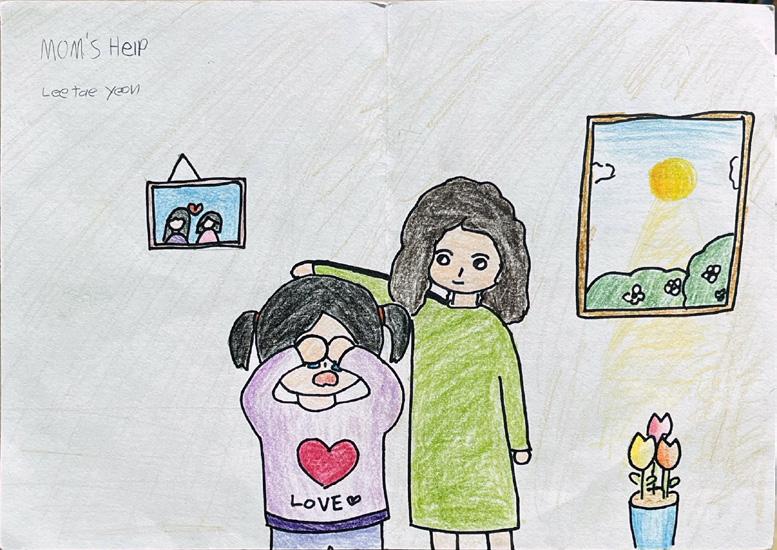 With colorful narratives, all of our elementary school winners conveyed the connections we make through our acts of kindness. First-place winner Sodam Han shared a cross - cultural exchange between a family traveling in Seoul, and a young girl stopping to take their picture in "A Memory of Kindness." Haewon Jeong placed second with "A Friend Who Listens," an emotive and youthful exchange of true friendship. The piece reminds us of the simple ways we express kindness daily, such as lending our ear to one another. Finally, our third-place winner, Taeyeon Lee, highlighted the unconditional love and devotion of family in their work, "Mom’s Help."