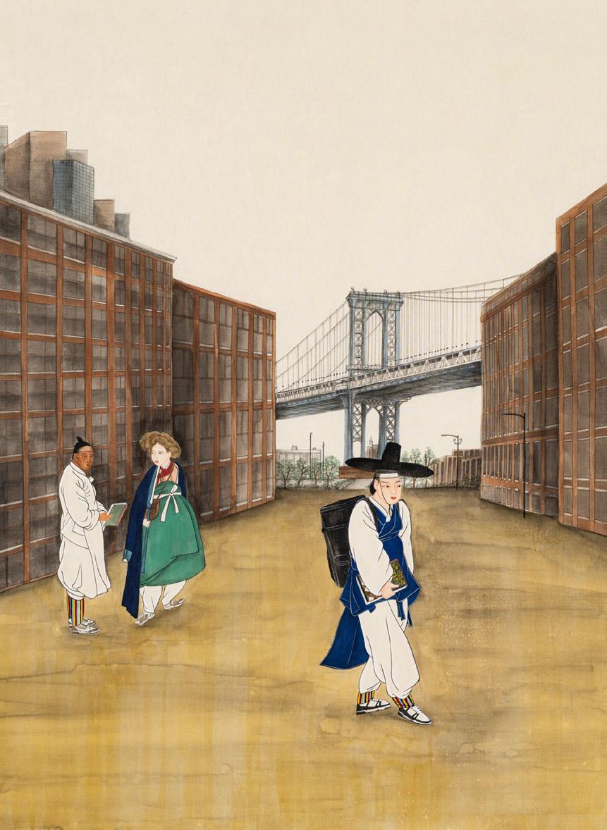 The artwork does this through removing barriers between time and space, symbolically showing how Fulbright Korea continuously brings people and nations closer together. It depicts Fulbright Korea’s constancy of purpose in fostering educational and cultural exchange through the presence of a seonbi 3 carrying a copy of The Great Gatsby along a street in Brooklyn, New York. Simultaneously, it depicts the development of cultural appreciation and integration through the blending of traditional and modernized hanbok worn by both the seonbi and the Americans standing to his left.