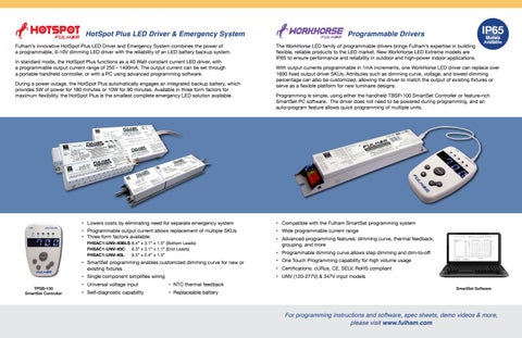 HotSpot Plus LED Driver & Emergency System Fulham’s innovative HotSpot Plus LED Driver and Emergency System combines the power of a programmable, 0-10V dimming LED driver with the reliability of an LED battery backup system. In standard mode, the HotSpot Plus functions as a 40 Watt constant current LED driver, with a programmable output current range of 250 - 1400mA. The output current can be set through a portable handheld controller, or with a PC using advanced programming software. During a power outage, the HotSpot Plus automatically engages an integrated backup battery, which provides 5W of power for 180 minutes or 10W for 90 minutes. Available in three form factors for maximum flexibility, the HotSpot Plus is the smallest complete emergency LED solution available.