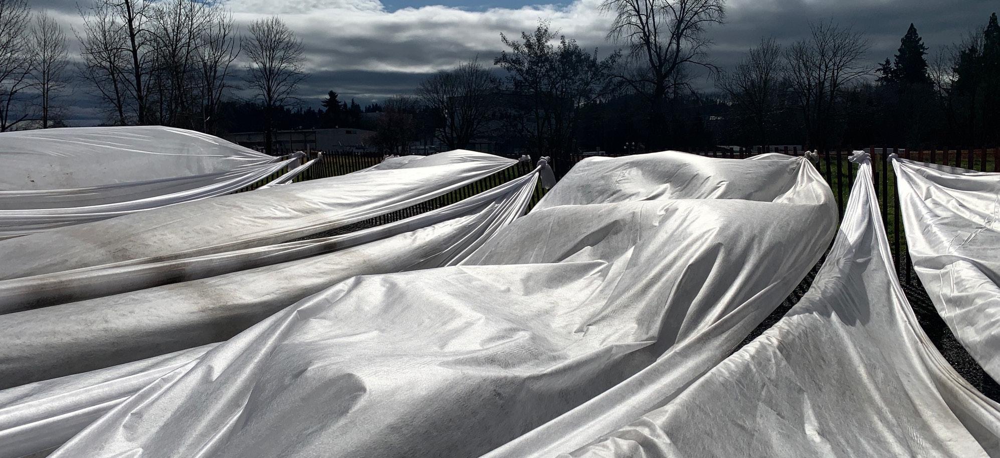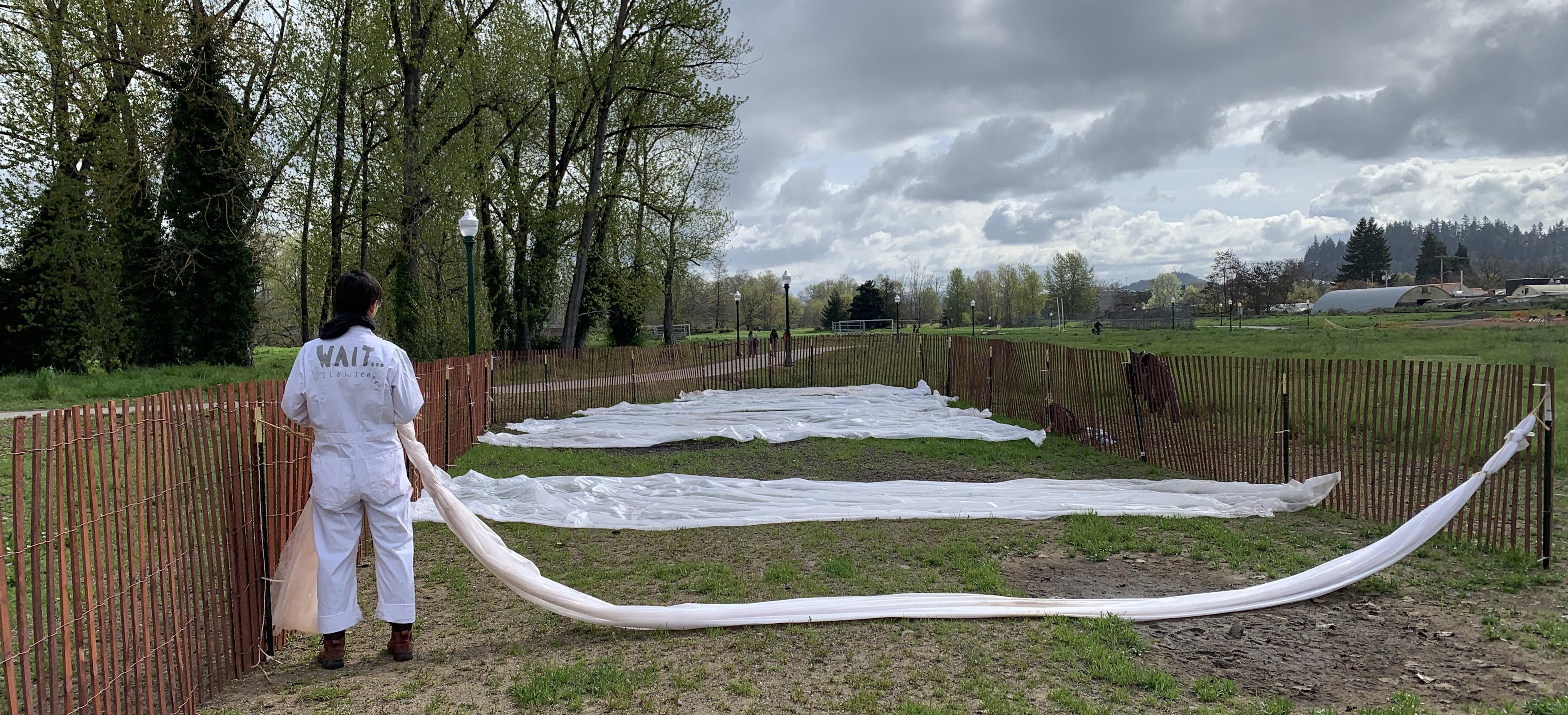 I’m using reemay as a part of the material palette that we developed early on in this project as a way to draw attention and curiosity to the tree to cue visitors into the narrative of the site. These cottonwoods can be looked at as past and future ghosts. Their presence tell stories of landscape altering events, while providing habitat for many species here–and will continue to do so into the future. The cottonwoods highlighted here are on their way to becoming future snags. ((In times before extraction, development, and flood control interrupted this landscape, Black Cottonwoods would have likely rooted after major flood events changed the path of the river, providing conditions for riparian forests to follow. These cottonwoods, however, are the result of post extractive, post-dumping disturbance to this landscape. Often referred to as ‘trash trees’, they indicate emergence and survival after violent disruption that prioritized resource over connection. These Cottonwoods can be looked at as past and future ghosts. Their lifespan tells stories of landscape altering events while their presence provides habitat for many species here–and will continue to do so into the future. What can we learn from the cottonwoods?))