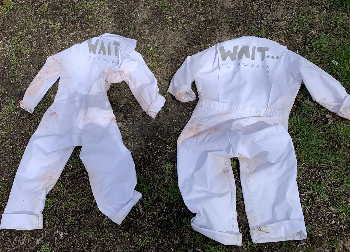 We wanted another way of communicating that in our research process, we were changing the site and also becoming part of it. We decided to wear uniforms when on the site as a representation of our commitment to this practice and a communication device that increased the visibility of our presence and impact. We chose these white coveralls because they would show dirt and grass stains, and highlight the passage of time through the materials of the place. There is also a performance aspect – we are highly visible when wearing these and passersby are more likely to interact with us. (Of course, this also relates to the Ukeles performance typology)