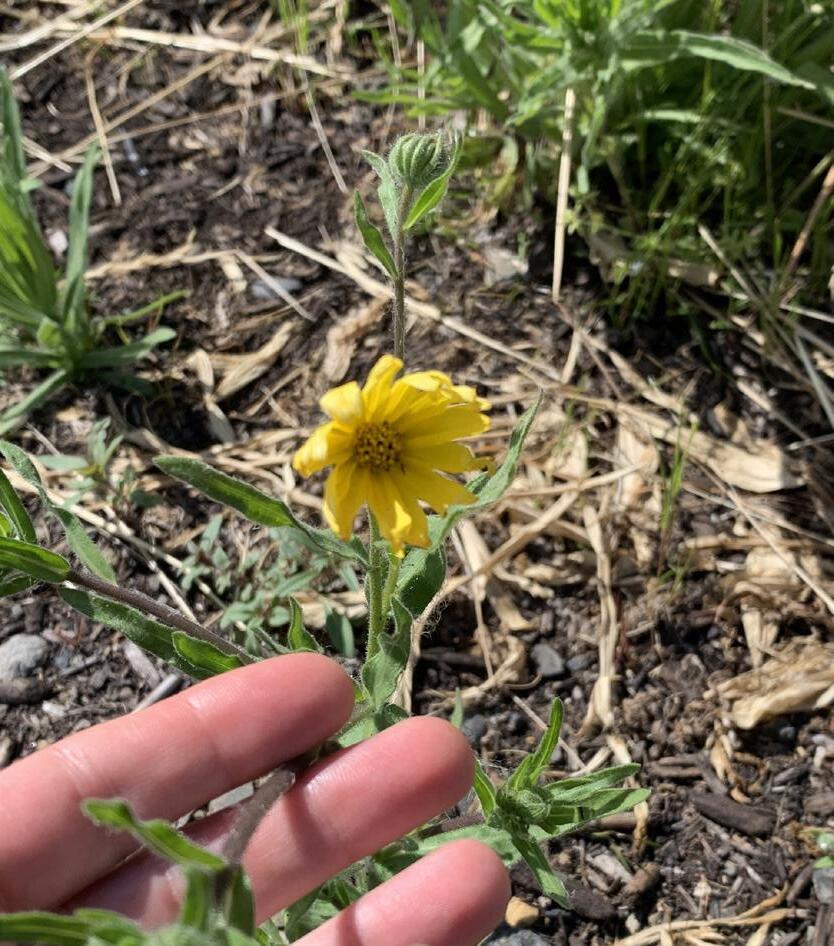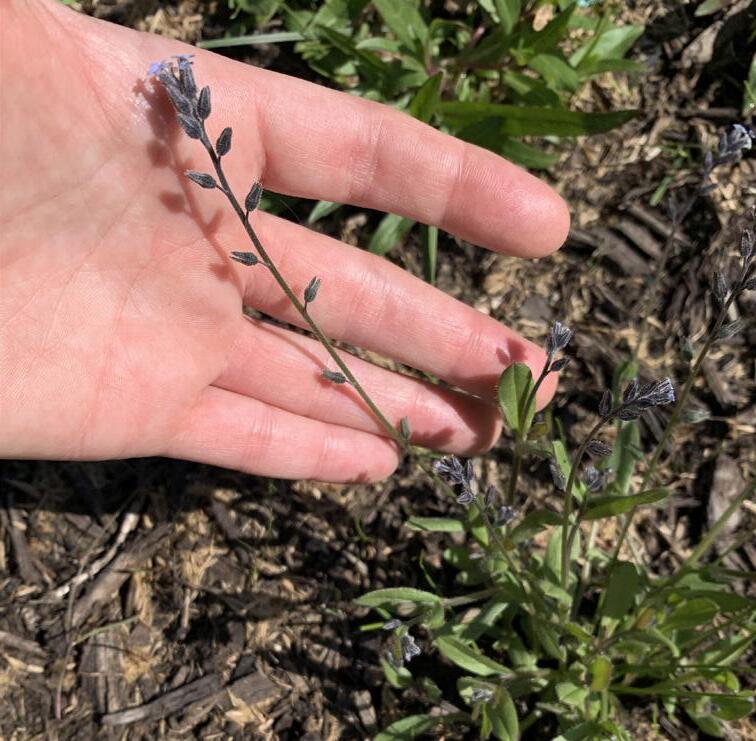 Following the construction of the water easement, the area through the center was very disturbed and compacted. It had been seeded in the fall but that seeding had failed, so we adopted it. Michael chose a seed mixture of pollinator-friendly native annuals and perennials with the help of Bart Johnson and Bitty Roy, and we spread that in February of this year. We also seeded along the pathway and this section here shows some of the plants we seeded: lupines, tarweed, gilia, for example.