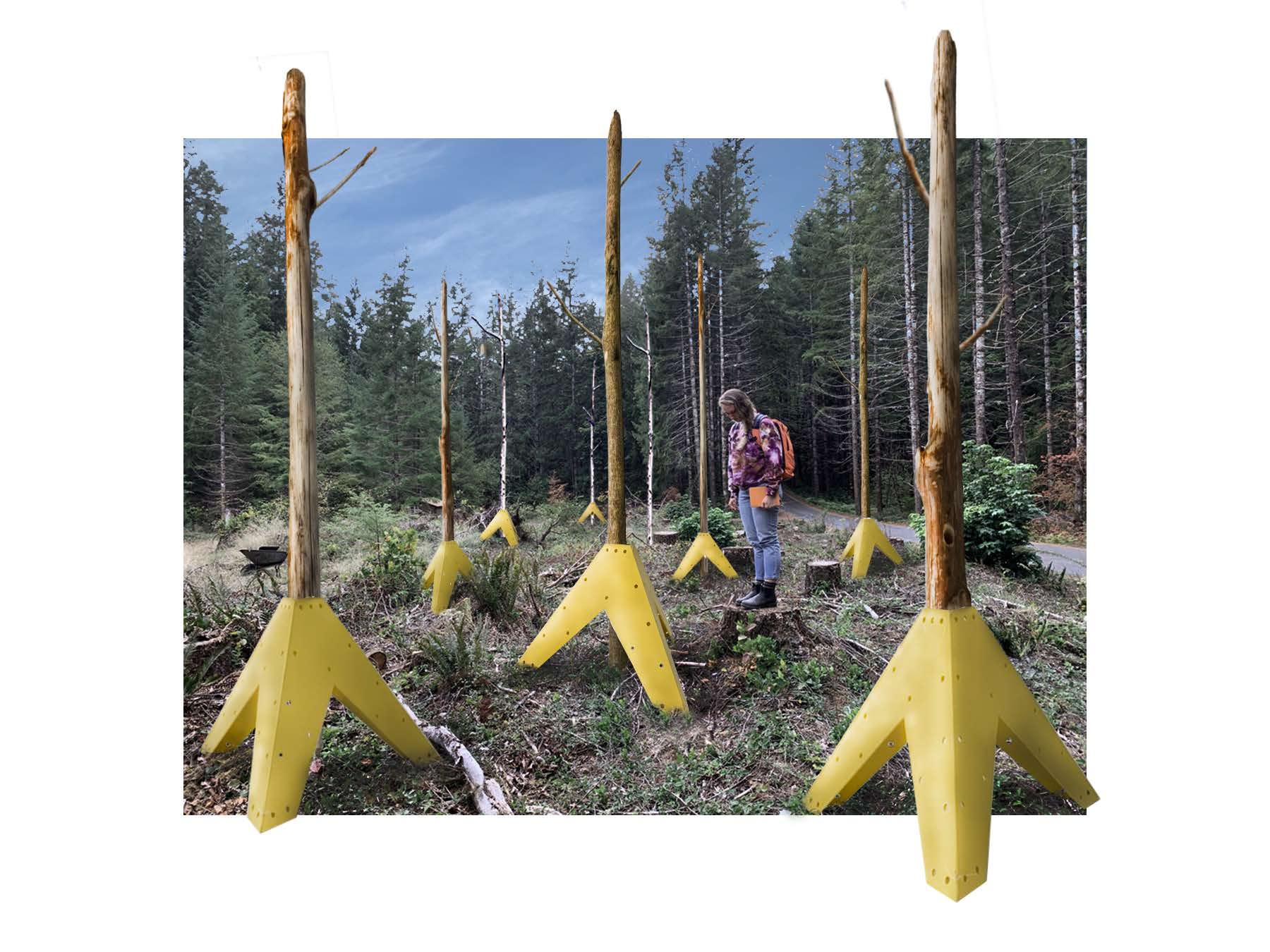 I’m currently in the process of exploring prototypes for a site-specific temporary installation that highlights the black cottonwoods here. I became inspired by the presence of the cottonwoods after seeing how students engaged with them during the workshop. Black Cottonwoods are dynamic, charismatic, and engaging, and are also indicators of ecosystems that emerge from disturbance. The installation is accompanied by a zine that contains prompts inspired or developed by students from Liska’s class as a way to facilitate openings for relational connections with these trees and the site.