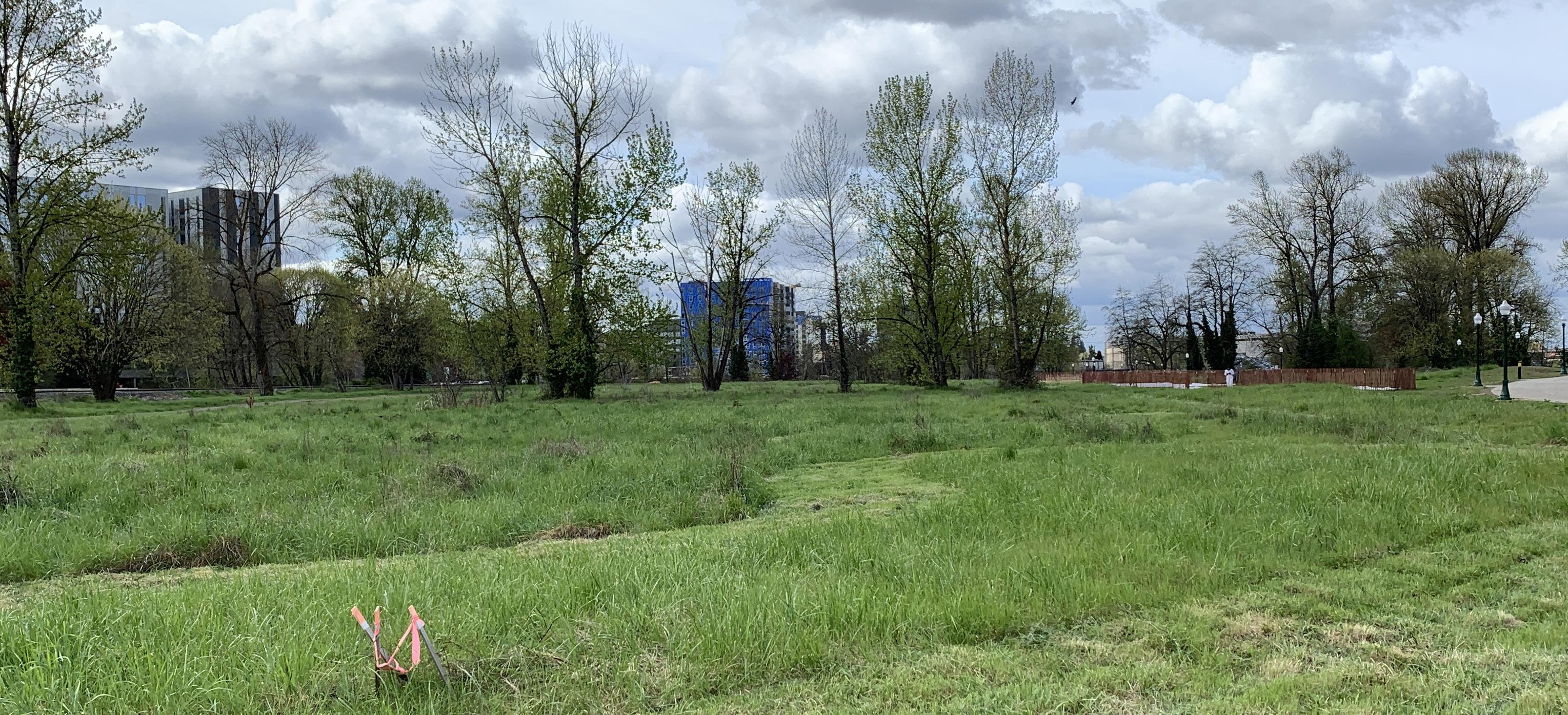For this project, the maintenance art typologies were explored on the North Campus Riverfront at the University of Oregon. This site was chosen for several reasons. Field work was central to the premise of this project and this site was easily acccessible. There was also landscape maintenance research already happening there. For several years prior to this project, Michael Geffel, my advisor and professor in the landscape architecture department, had been conducting field experiments in parametric mowing.