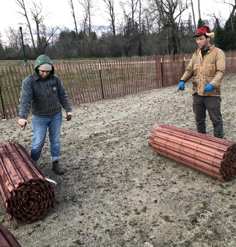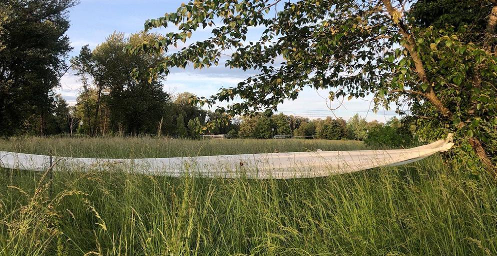 After seeding, we constructed the fence with the idea that it would help germination in the easement by keeping the geese from browsing. We sought to explore the creative potential and aesthetic properties of common landscape materials such as t-posts, temporary fencing and row cover fabric. The construction involved a collaborative process, and required maintenance and adaptation along the way.