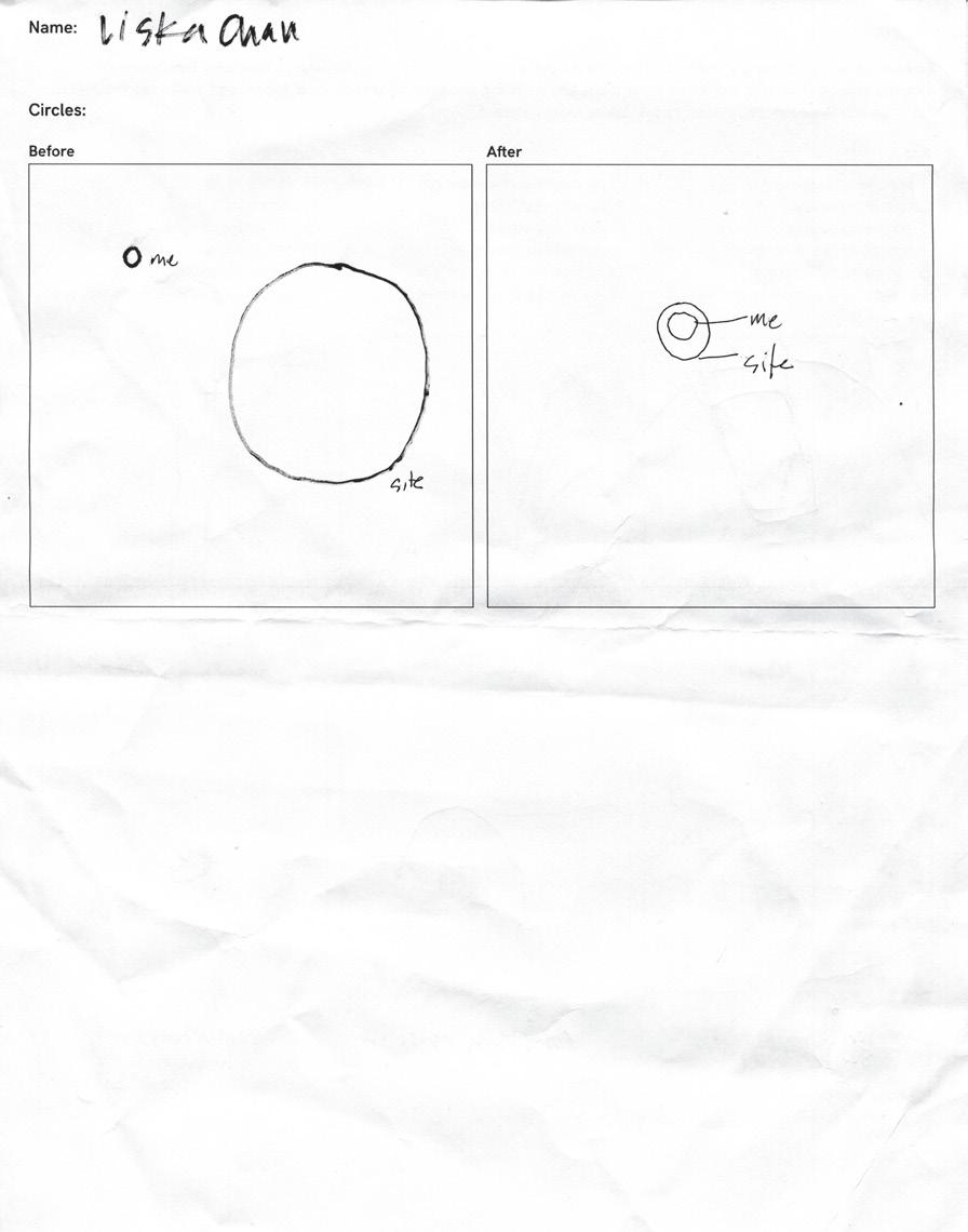 As a debrief, students diagramed their relationship to the site before and after the exercises. The diagrams and our final discussion showed many changes in perception of the site after we had created space for deep engagement. Some felt more a part of the landscape, while others felt that the complex dynamics that emerged as they learned more about the site made them realize how much they would never know.