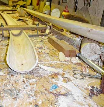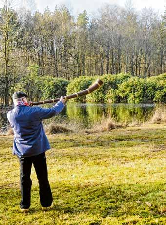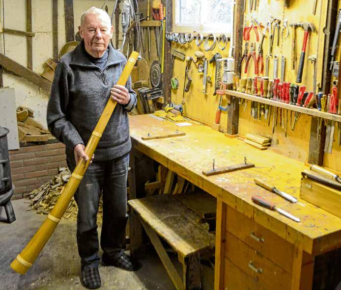 hoorns. “Ik ben na een tijdje gestopt met tellen.” Elk seizoen kwamen er wel drie tot vier nieuwe bij, en nog steeds maakt Wim één tot twee hoorns per jaar. Zijn eerste hoorn was wat zwaar, en het mondstuk maakte hij van een stuk elektrische pijp. “Ik hoorde later dat het mondstuk van vlierhout moest worden gemaakt,” lacht Wim. “Met de jaren word je steeds beter.”