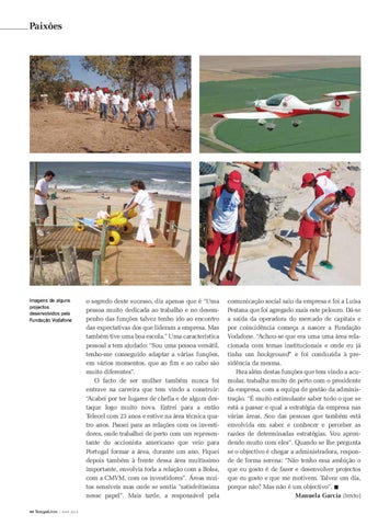 comunicação social saiu da empresa e foi a Luísa Pestana que foi agregado mais este pelouro. Dá-se a saída da operadora do mercado de capitais e por coincidência começa a nascer a Fundação Vodafone. “Achou-se que era uma uma área relacionada com temas institucionais e onde eu já tinha um background” e foi conduzida à presidência da mesma. Para além destas funções que tem vindo a acumular, trabalha muito de perto com o presidente da empresa, com a equipa de gestão da administração. “É muito estimulante saber tudo o que se está a passar e qual a estratégia da empresa nas várias áreas. Sou das pessoas que também está envolvida em saber e conhecer e perceber as razões de determinadas estratégias. Vou aprendendo muito com eles”. Quando se lhe pergunta se o objectivo é chegar a administradora, responde de forma serena: “Não tenho essa ambição o que eu gosto é de fazer e desenvolver projectos que eu gosto e que me motivem. Talvez um dia, porque não? Mas não é um objectivo”. I Manuela Garcia (texto)