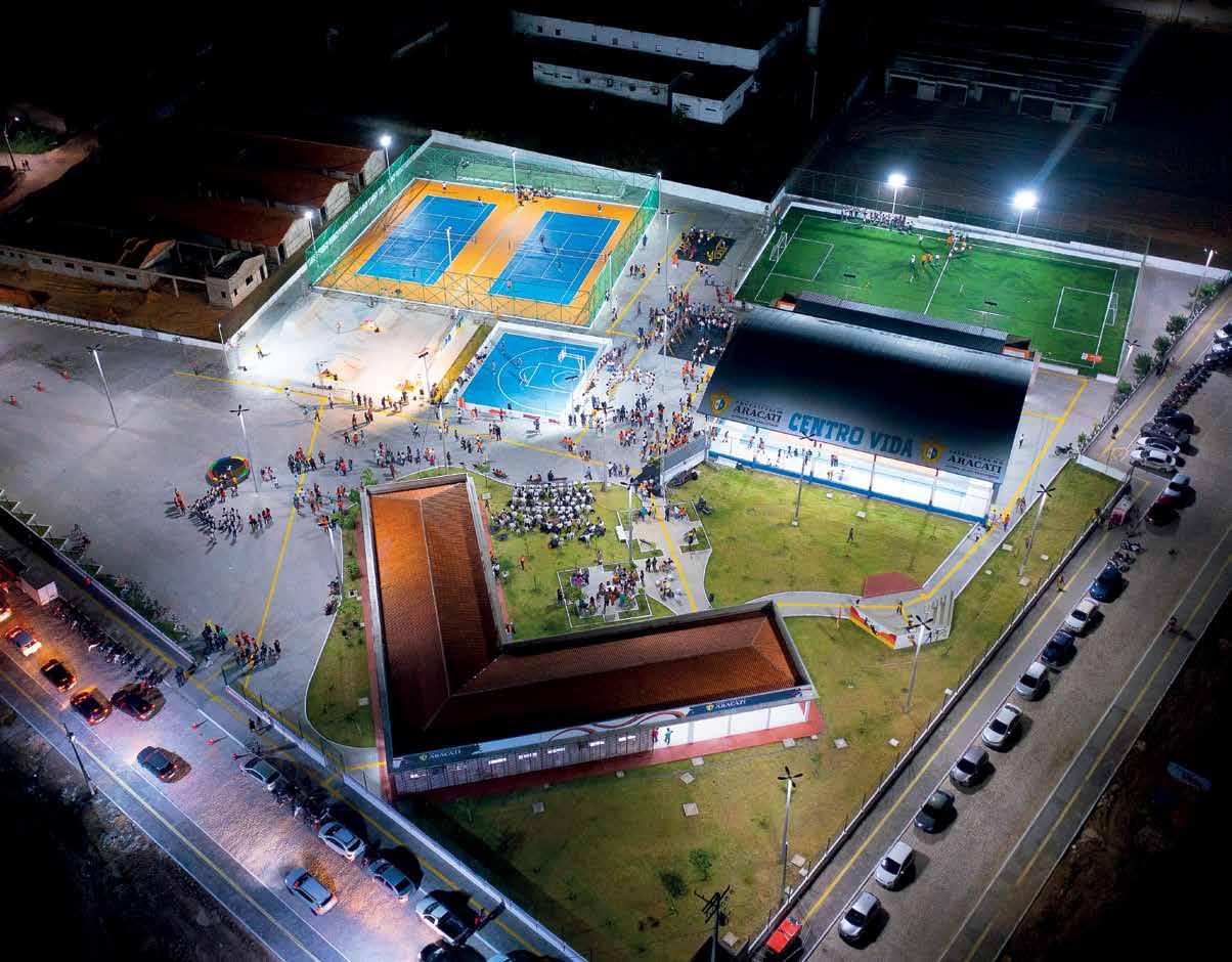 Com exceção de Fortaleza, nenhum município do Ceará tem tantas Areninhas como Aracati. Eu passei a entender, a partir da nossa primeira, o grande impacto social que ela causa. Muito mais do que o esporte, ela se transforma no ponto de referência das pessoas. Lá estão a mamãe, a madrinha, o tio, a tia, a vizinha etc. Todo mundo se beneficia com os bancos, as sombras das árvores e a iluminação.