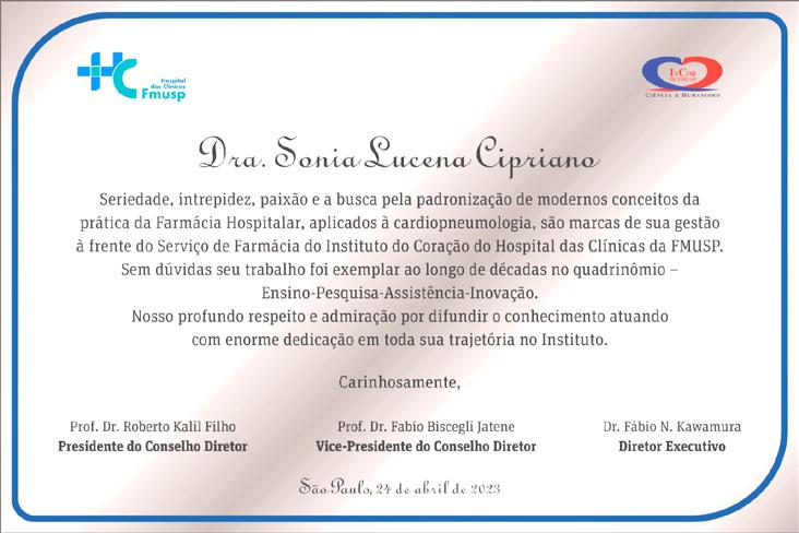 “Faz pouco tempo que estou na equipe de farmacêuticos do InCor e, do pouco tempo que tive contato com a Dra Sonia, é perceptível o respeito e admiração que todos têm por ela. Apenas mostra todo o fruto do seu trabalho e sua dedicação ao Serviço de Farmácia. Obrigada por todos os ensinamentos!”