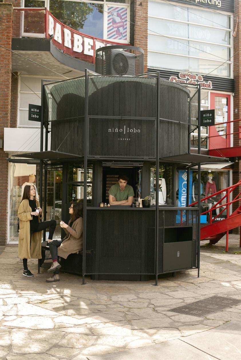 La latita es una pieza compacta y multifuncional. Es a la vez café, área para sentarse al aire libre, barra, espacio para residuos y alimentación para perros de la calle. Durante el día se despliega como una suerte de pieza Victorinox mientras que por la noche se compacta para transformarse en jaula lumínica, hito de la ciudad. La interacción de esta pieza con la calle y el uso de materiales nobles dejan en evidencia la voluntad de Niño Lobo de mostrarse como una marca urbana y decontracturada. A pesar de ser pequeño en escala, destaca por su morfología cambiante y por su carácter de alfiler urbano