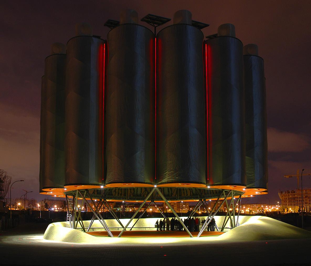 el máximo aprovechamiento y movimiento de la construcción preexistente, o sea una estructura de hierro o esqueleto de ocho patas vinculados por un anillo superior que produce el facetado del cilindro superior y permite acudir a un sistema modular para el objeto, una piel de metal desplegado –que se nombra como anillo– para un límite perimetral expandiendo la superficie de uso y