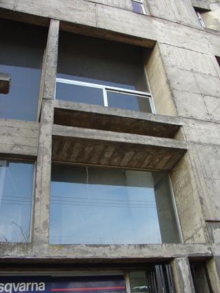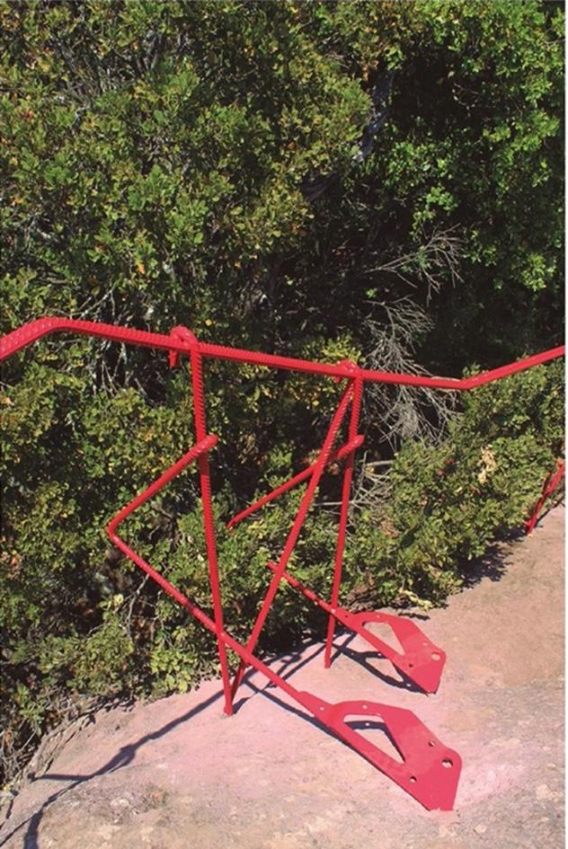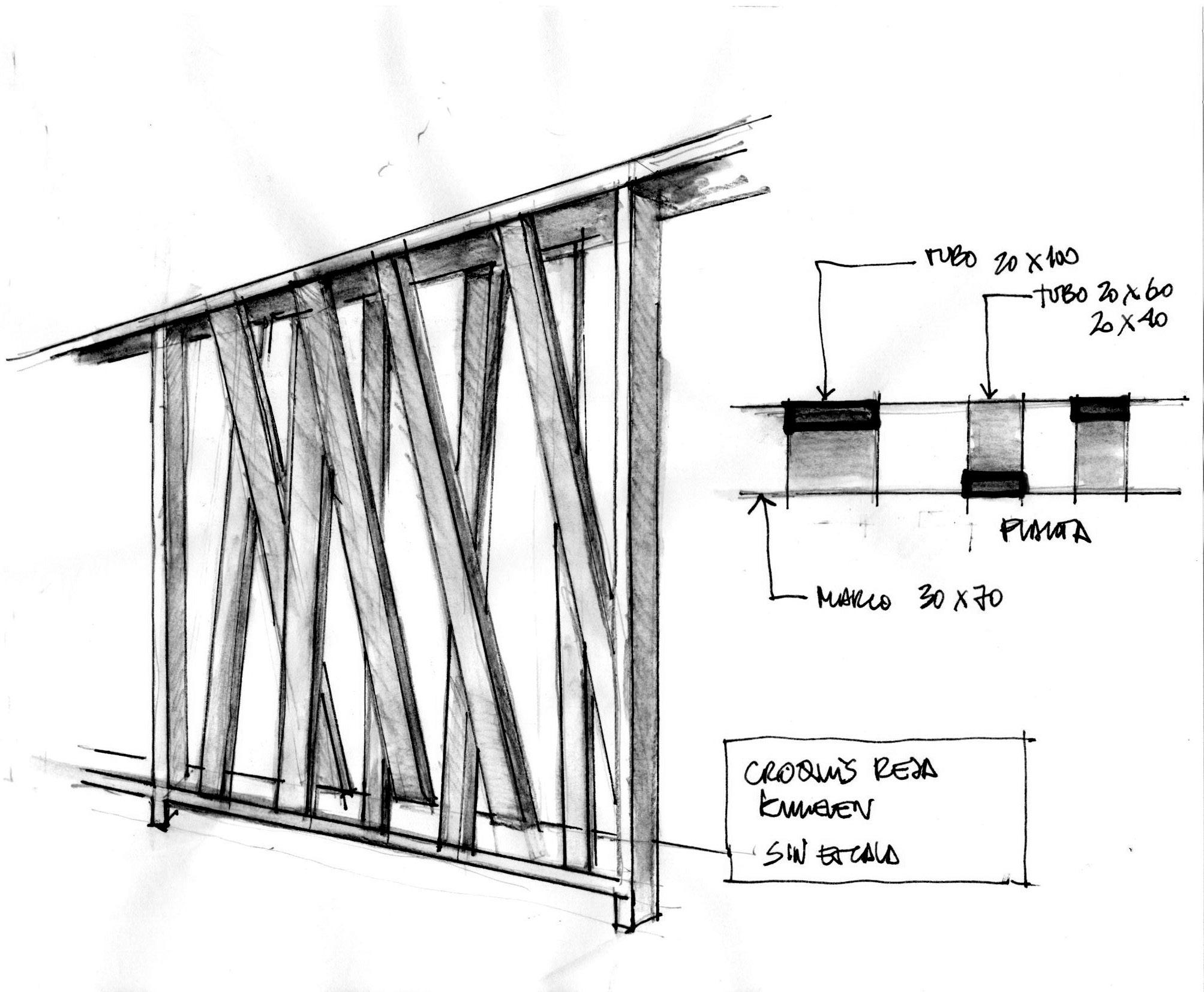 En el descanso de la rampa en la fachada norte de la Copelec, se trató de hacer visibles todos estos 16 tamaños mediante el dimensionamiento vertical de los elementos que la conforman.