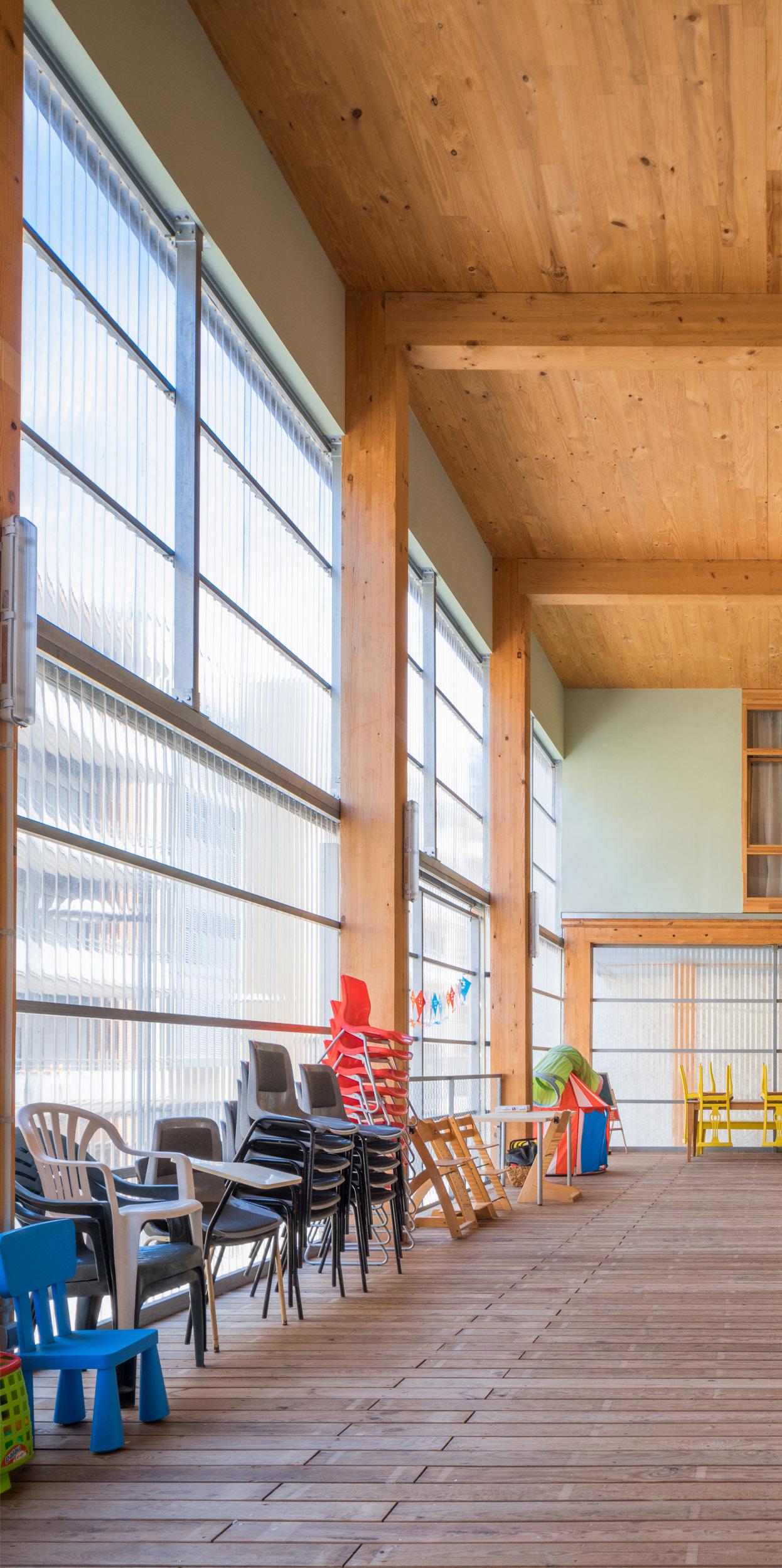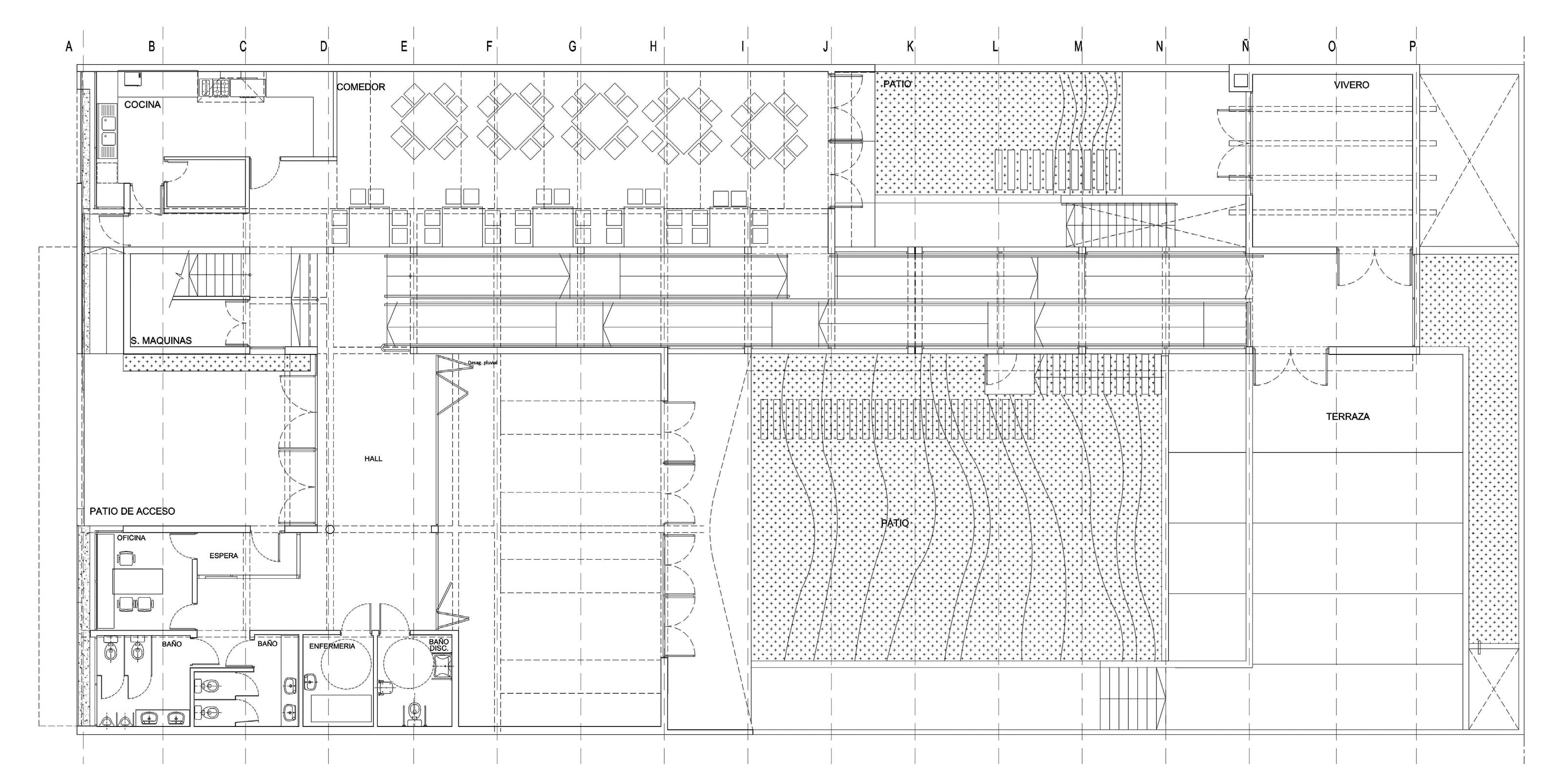 prefabricado. Biblioteca, aulas y cafetería se ubican en el lado oeste del eje. En el lado opuesto, se ubican los volúmenes de aulas, gimnasia artística, danza y auditorios.