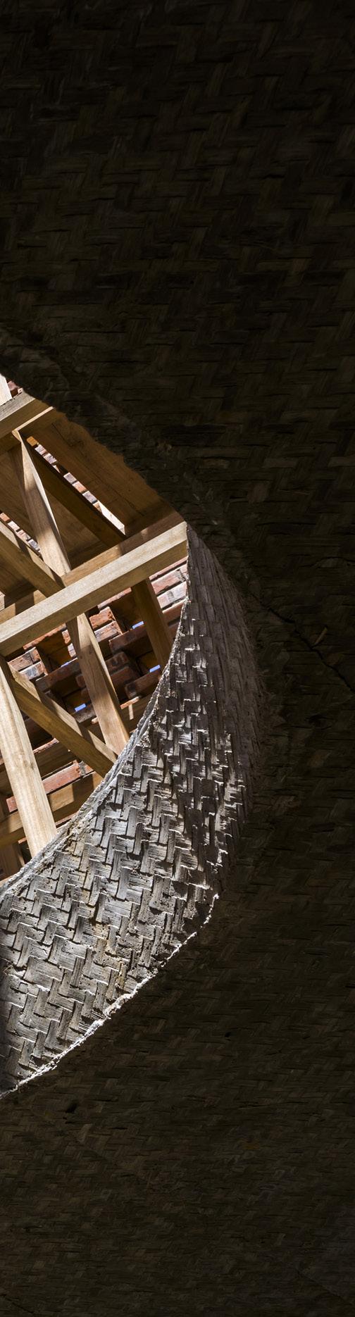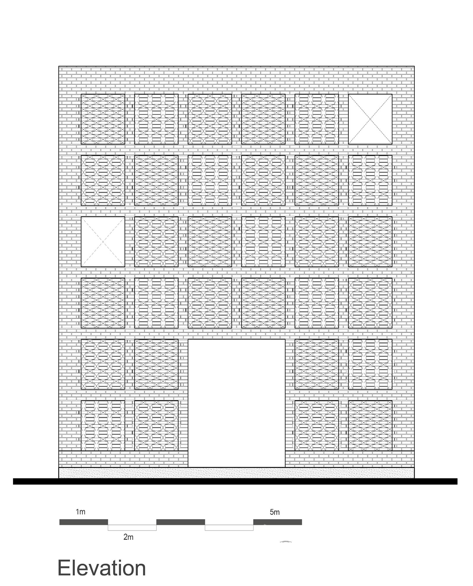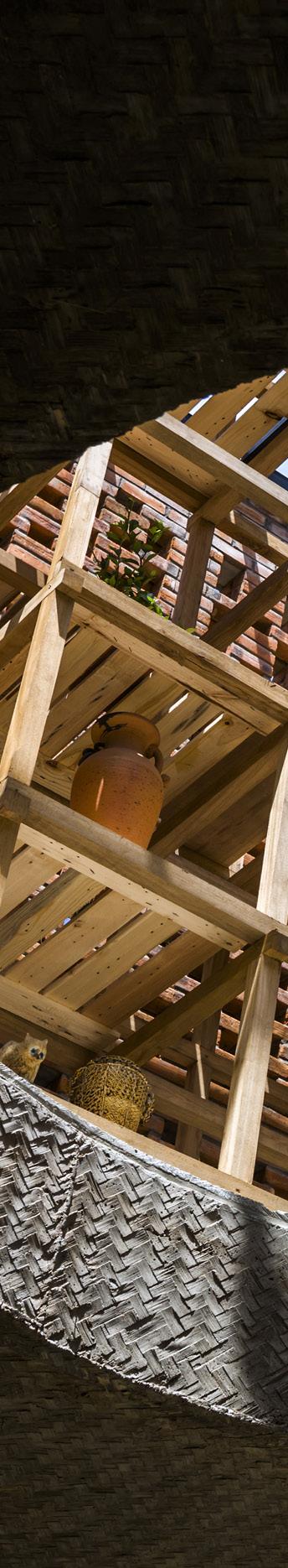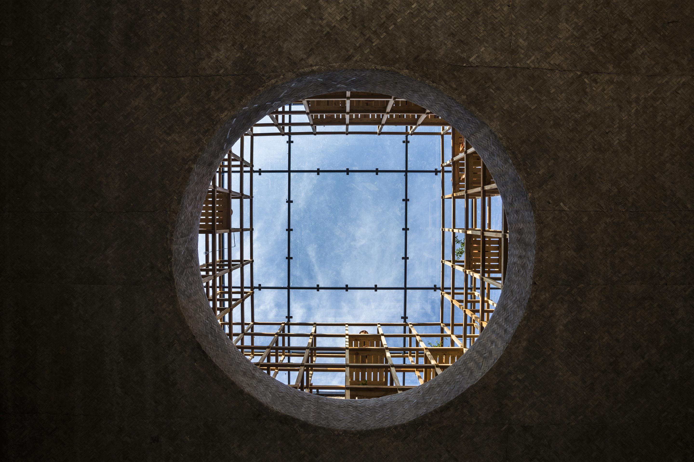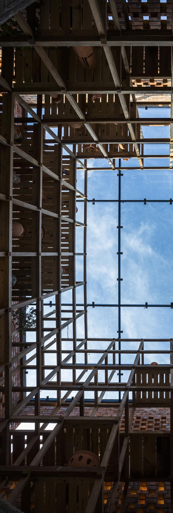 Este proyecto es un edificio en forma de cubo de un volumen de 7m x 7m x 7m. Alrededor del estudio hay una plataforma con estructura de bambú que se utiliza para secar productos de terracota. Además, está diseñado con dos grandes bancos para descansar, relajarse y tomar el té. Esta plataforma elevada también sirve como valla para separar el estudio de la zona del taller.