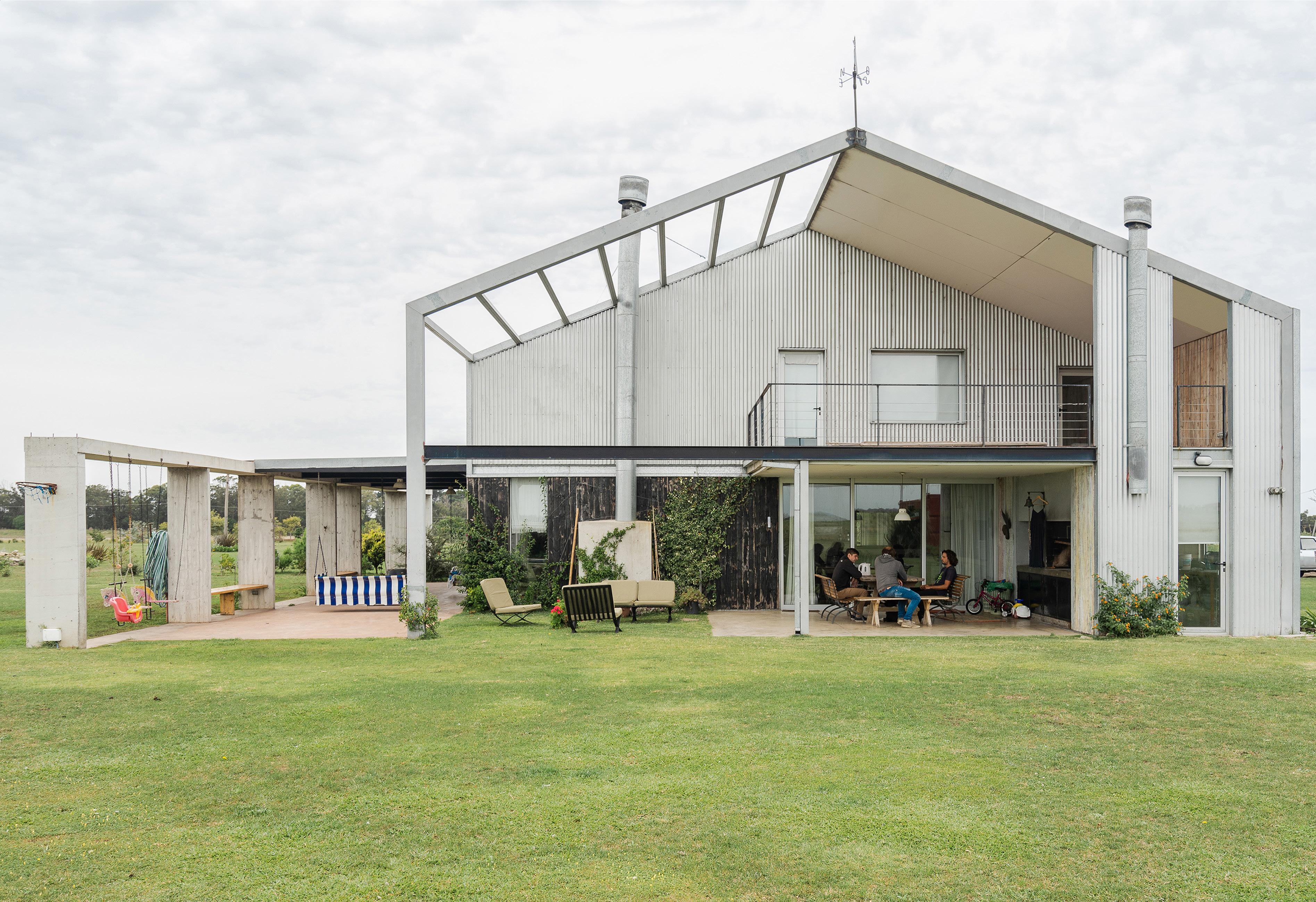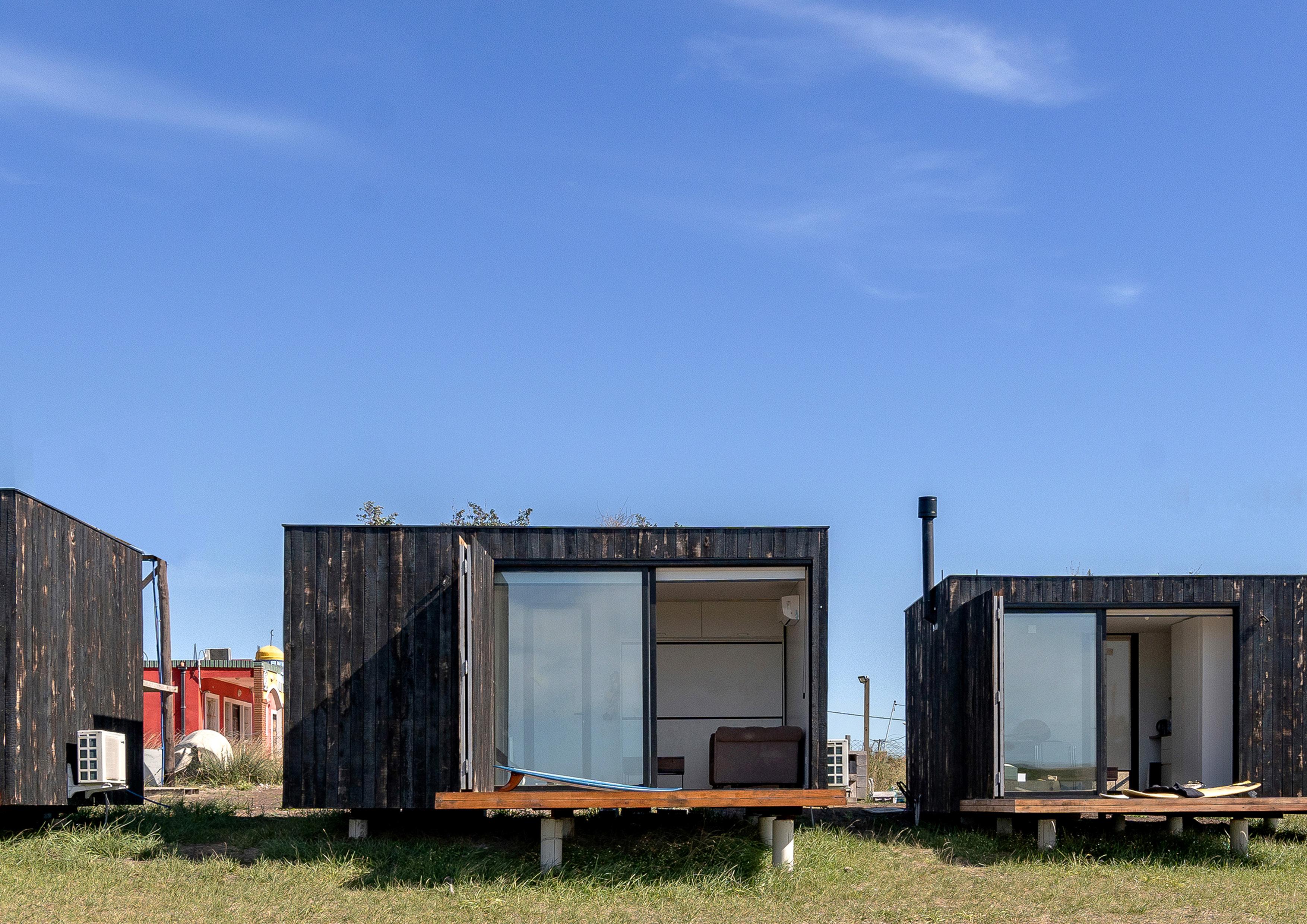 Tres amigos amantes del surf deciden alquilar un terreno frente a una de las pocas playas aun vírgenes entre Mar del Plata y Miramar. Su pedido: un espacio pequeño donde albergarse un par de noches y herméticamente cerrado a la hora de irse. Por último, debía ser transportable. A partir de estas premisas decidimos replicar un módulo tipo refugio con los servicios y las comodidades necesarias donde cada uno de ellos se apropie el espacio libre a su manera. Es así como uno teniendo dos hijos armó una serie de cuchetas, otro siendo soltero una especie de refugio espiritual donde cada rincón habla de su ser y por último un tercero siendo también soltero, pero con otra personalidad tan diferente. Todo un estudio sociológico, como 3 amigos con un mismo deseo se apropian de 15m2 de maneras tan diferentes. Al ser transportable cuenta con una estructura principal de hierro y una perfilería perimetral de steel frame. El revestimiento exterior de madera quemada propone cero mantenimiento y una serie de portones plegadizos genera reparo del sur al estar