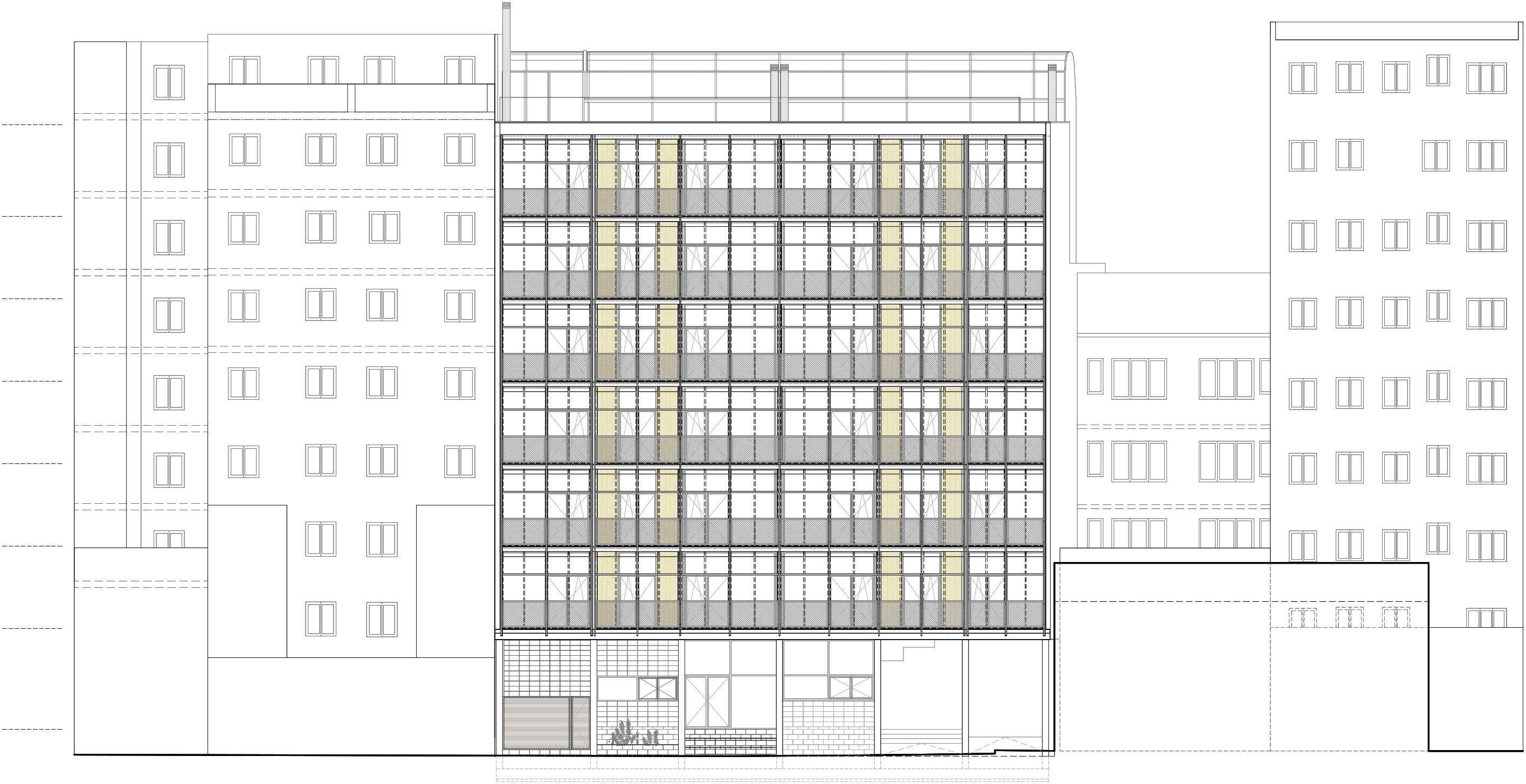El vacío central es un cuadrado. Sin un programa previamente definido, articula los programas en torno a él, a través de recorridos y puentes sugeridos en el primer piso, y permite diversos usos a lo largo de sus asientos y espacios libres. Los colores elegidos para las fachadas interiores (que varían del amarillo al verde) contribuyen a la diversidad y la atmósfera lúdica de esta plaza interior.
