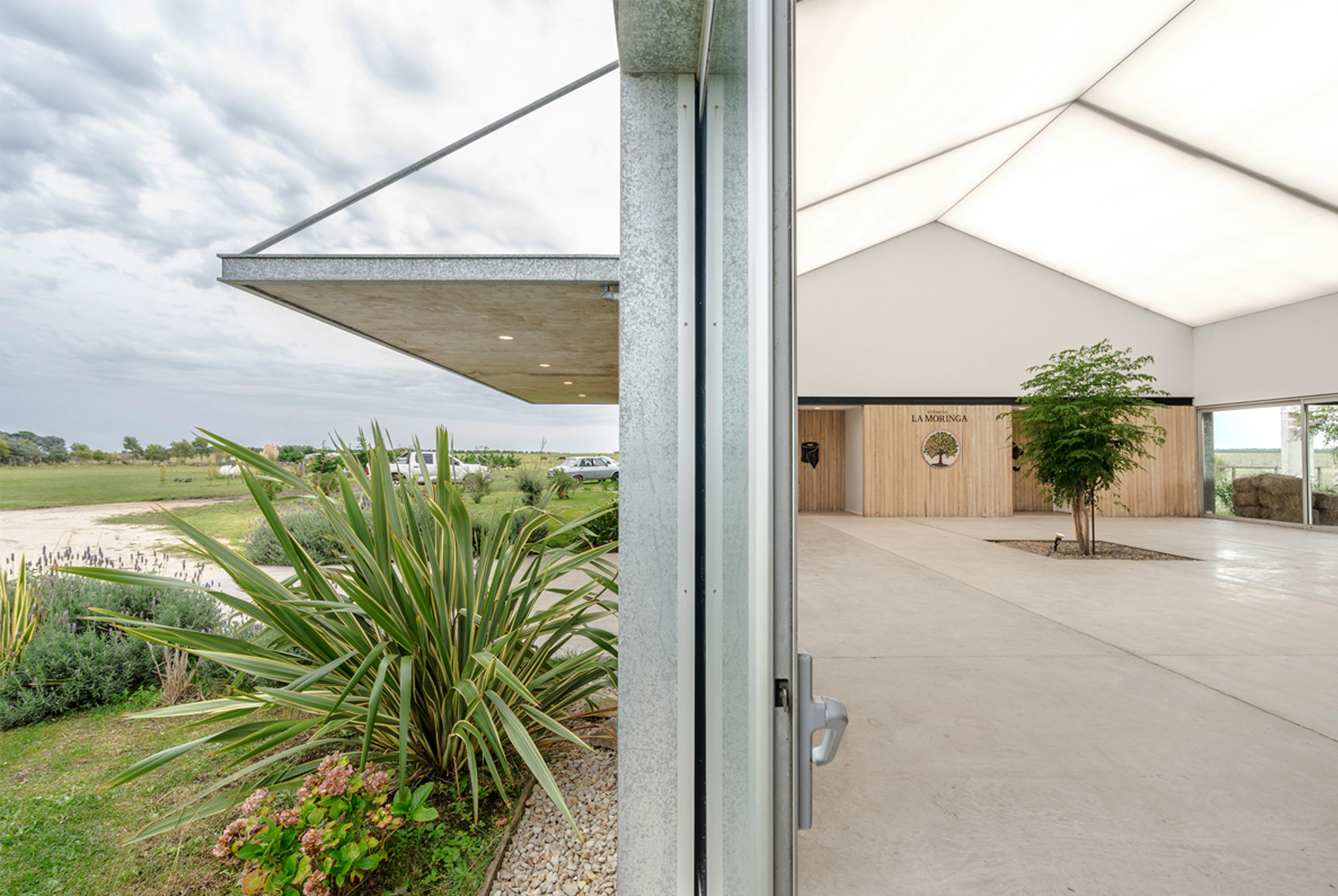 Se expresa asi el doble interes en proveer un pabellón muy fluido y transparente en una implantación de gran calidad paisajística y la citación en colores y texturas de lo que la empresa comitente produce en materiales cementicios.