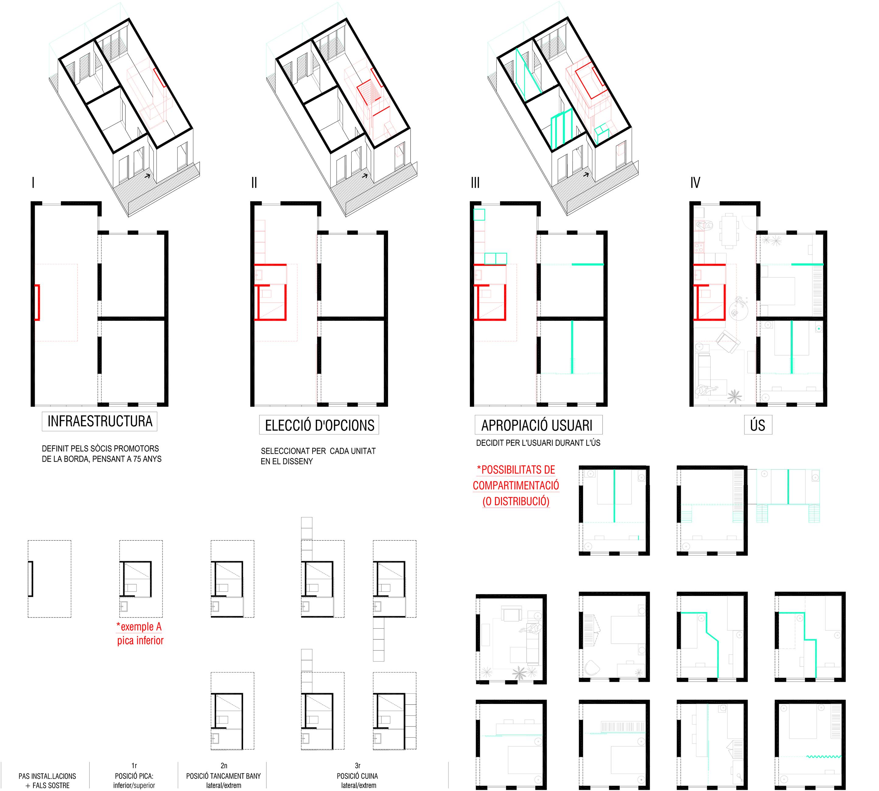 La apuesta de La Borda por un modelo de autodesarrollo comunitario ha permitido superar algunas de las limitaciones existentes en los desarrollos convencionales, ya sean públicos o privados. En el primero de ellos, el miedo al futuro residente –completamente desconocido– imposibilita introducir cambios en un modelo habitacional prefabricado. En el segundo, una imposición de los dictados del mercado da como resultado la mediocratización de la vivienda para facilitar su adopción como artículo de consumo. El proceso de desarrollo innovador ha sido clave para permitir que el trabajo arquitectónico vaya más allá de cuestiones de diseño meramente formales. Diferentes características del proyecto creemos que lo ayudarán a destacarse en el contexto más amplio de la vivienda colectiva: autodesarrollo, concesión de uso, vida comunitaria, sostenibilidad, asequibilidad y flexibilidad y adaptabilidad.