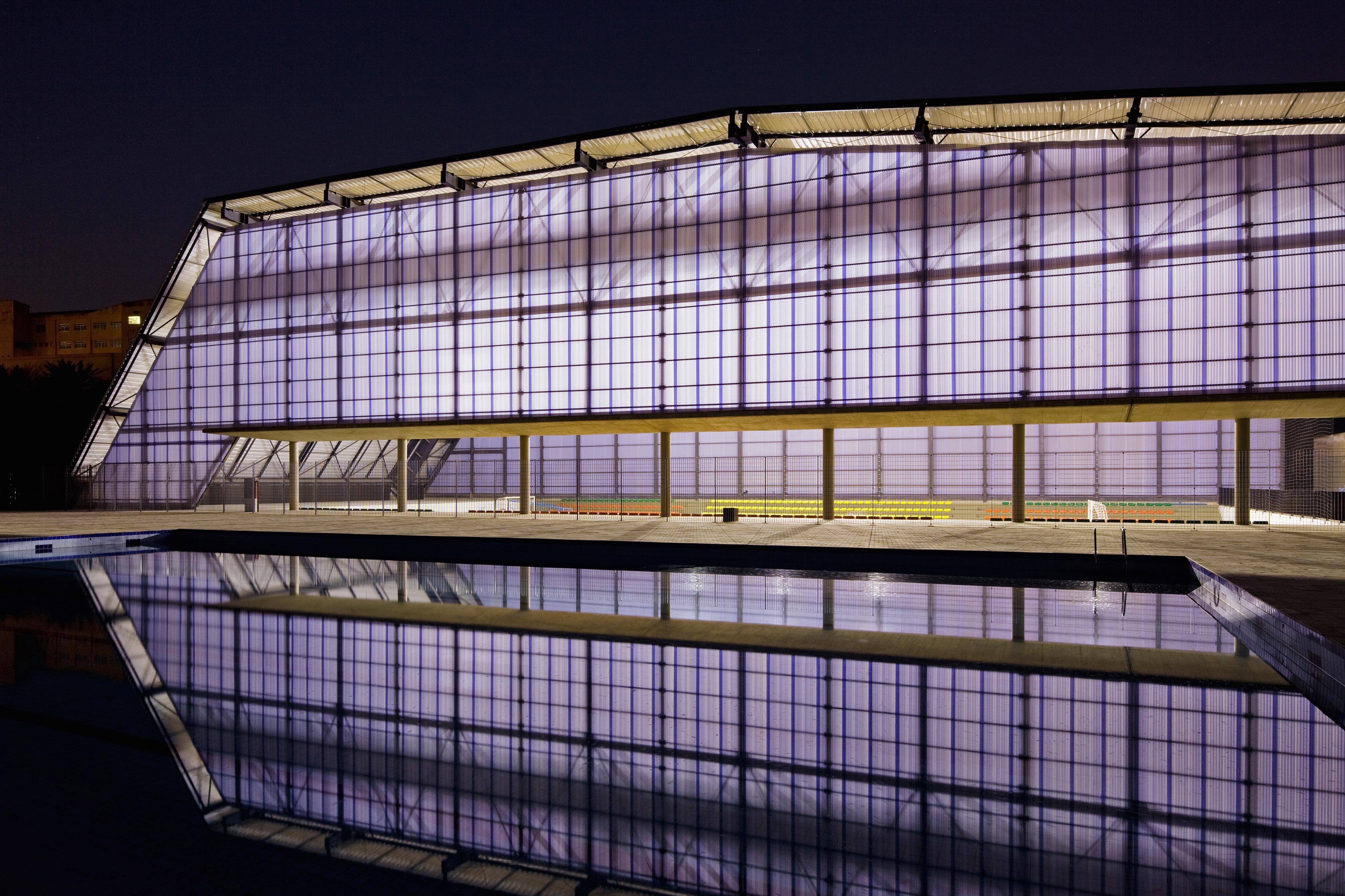 El proyecto se configura en línea, materializado en una gran cubierta metálica que alberga en sus márgenes longitudinales diferentes usos, articulados por un vacío que culmina en una zona central dedicada al uso deportivo. El complejo acuático se sitúa fuera de este eje, en la zona exterior.
