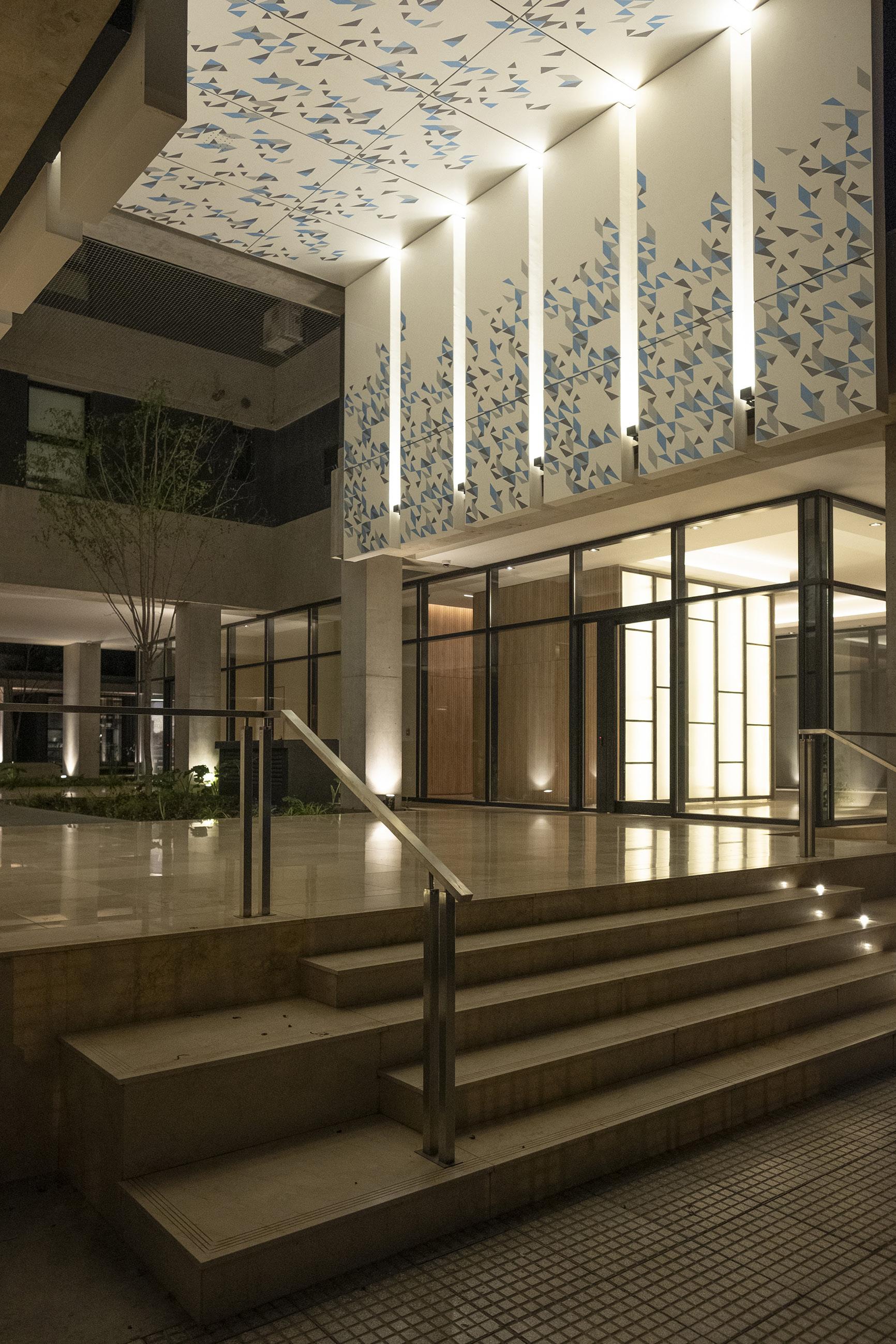 La propuesta busca establecer algunas cuestiones diferenciales de la estructura clásica de basamento, cuerpo y remate, promoviendo relaciones fluidas entre el espacio público y el espacio privado interior. La relación con el entorno se construye a partir de una arquitectura de planta baja más permeable, donde una secuencia de espacios y transparencias permite atravesar visualmente el lote desde el frente hasta el fondo. Esta operación mitiga la densidad del edificio con su entorno inmediato y mejora la calidad del espacio urbano.