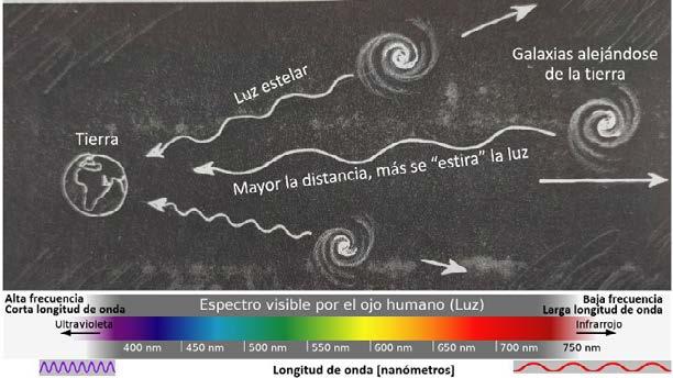 Los astrónomos han descubierto que las galaxias distantes se están alejando unas de otras y de la tierra. En consecuencia, la luz emitida a una cierta longitud de onda desde estrellas distantes parece estirada o “desplazada al rojo”. Además, cuanto más lejos