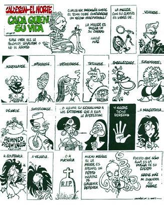 -Y a propósito del derecho de la mujer sobre su cuerpo -dije a manera de conclusión-, déjeme decirle, señora diputada, que hace unos 10 años apareció en el periódico El Norte de Monterrey, un estupendo cartón, firmado por Paco Calderón (para mí el mejor caricaturista de México) que casi me aprendí de memoria, el cual, en cuadros consecutivos, más o menos dice lo siguiente (acompañados, por supuesto, con muy sugestivos dibujos): “La mujer es dueña de su cuerpo, de nadie más / la mujer con su cuerpo es libre de…/ vestirse/, maquillarse/, operarse/, intoxicarse/, tatuarse/, embellecerse/, ejercitarse/, dejarse/, satisfacerse/, pero nadie tiene el derecho…/ a molestarla/, a golpearla/, o a matarla / (y en un cuadro final) … mucho menos si la mujer es apenas un fetito incapaz de cualquier defensa, puesto que sólo ella es dueña de su cuerpo… nadie más, ni siquiera su madre” (Calderón en El Norte, 18/08/1989).