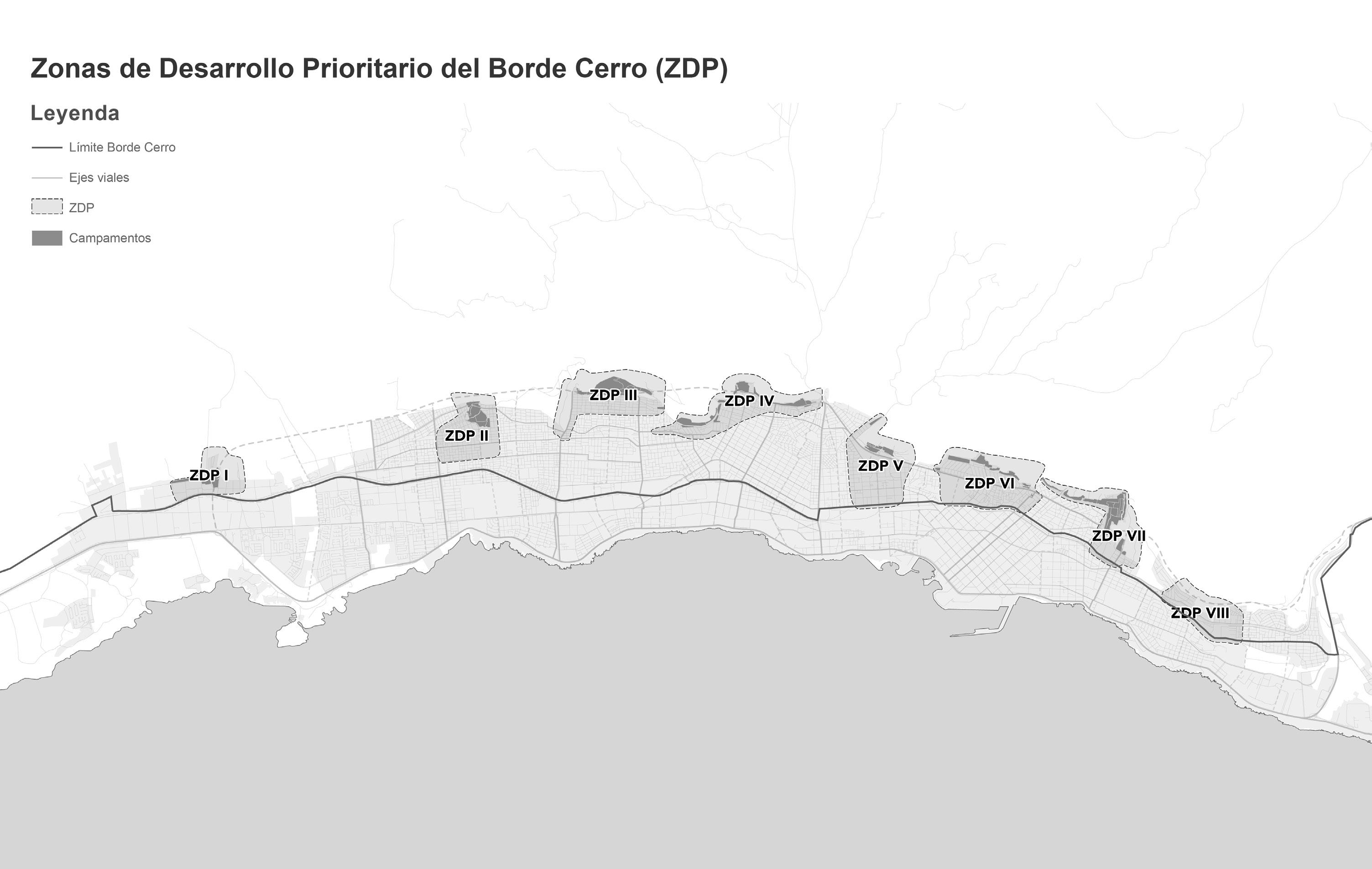 El polígono de estudio y planificación urbano-habitacional, el Borde Cerro de la Ciudad de Antofagasta, limita al poniente con la faja ferroviaria ajustada a la trama vial, al oriente con la primera línea de cumbres de la Cordillera de la Costa, al norte con la quebrada La Chimba, y al sur con la quebrada La Negra. Dentro de este sector, se identifican 8 Zonas de Desarrollo Prioritario (ZDP), que concentran diversas brechas urbanas y sociales, así como campamentos.
