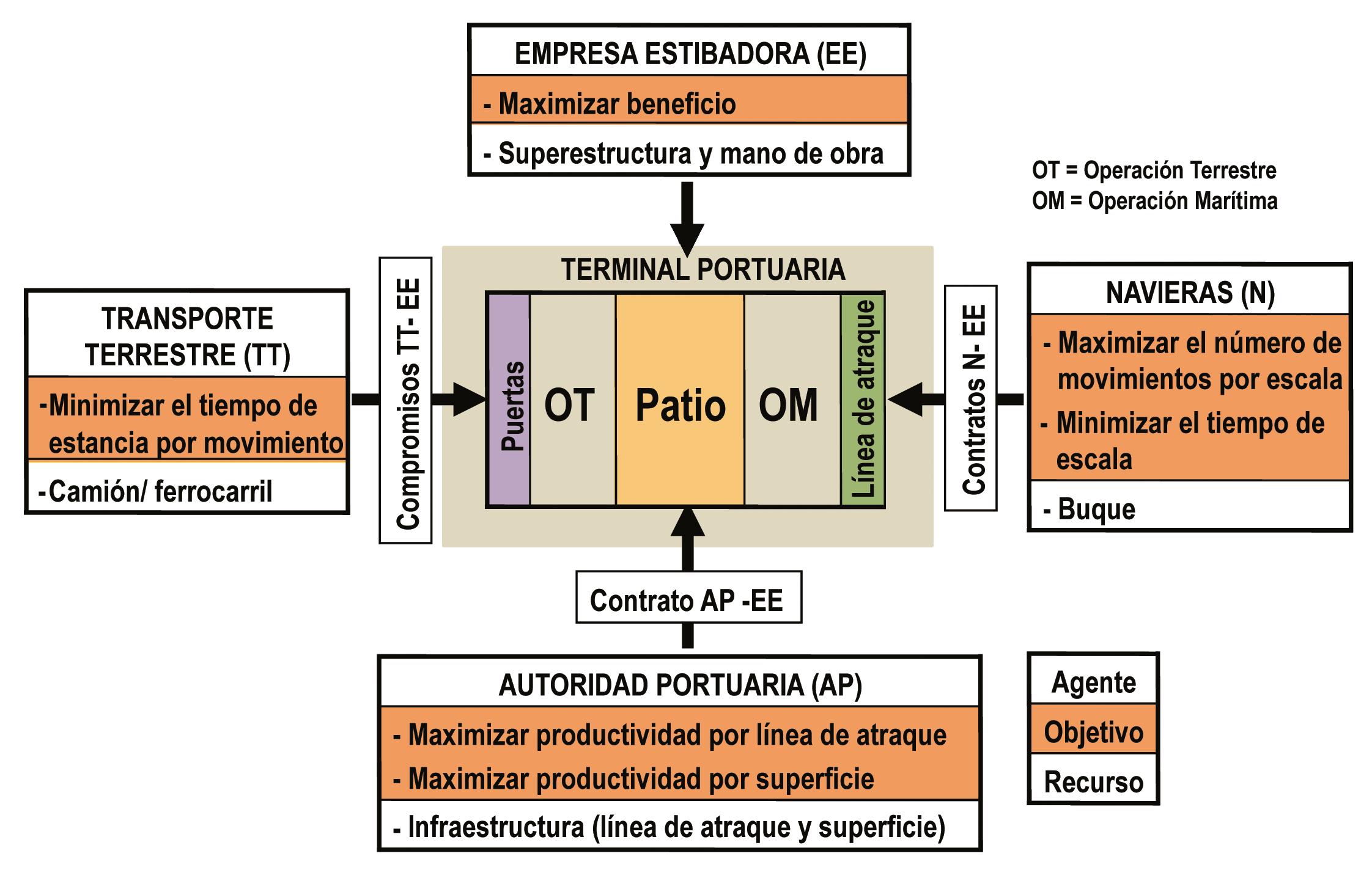 Conviene añadir que en la segunda de las monografías, bajo el título de “Manual de capacidad portuaria: aplicación a terminales de contenedores” (Monfort et al. 2011b) se aportan propuestas relacionadas con la de nición y medición de aspectos críticos en la gestión de las terminales como el rendimiento operacional, la e ciencia, la capacidad y el nivel de servicio que deben conformar el lenguaje común de entendimiento entre los distintos agentes que interaccionan en la terminal portuaria (Figura 2).