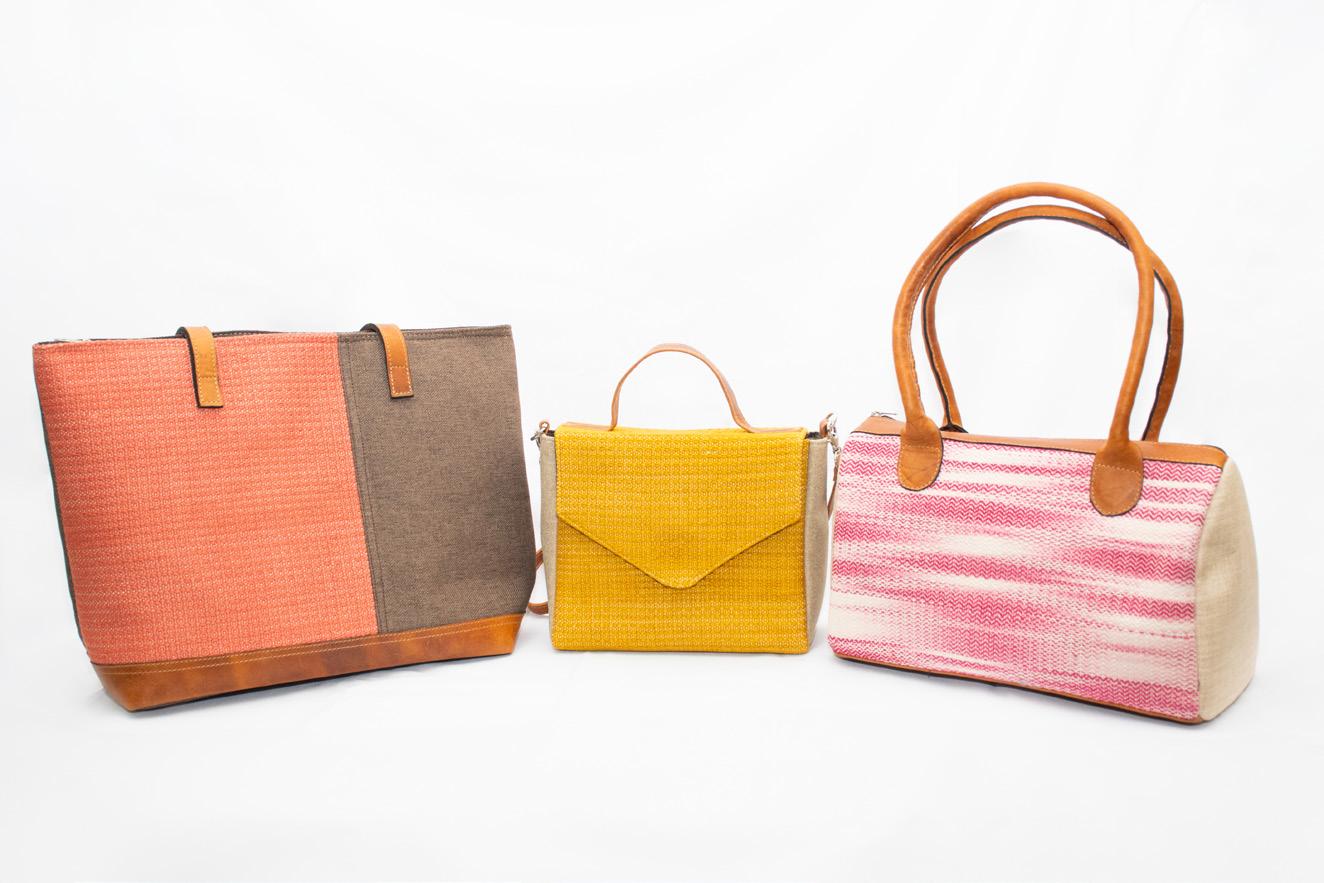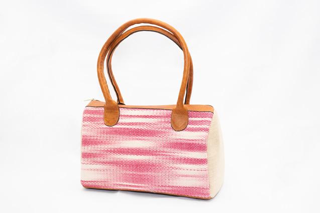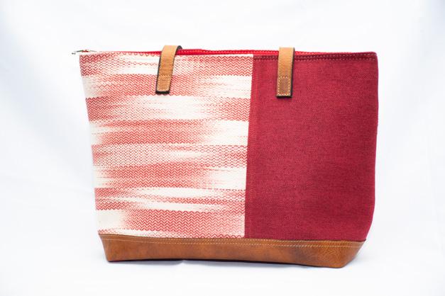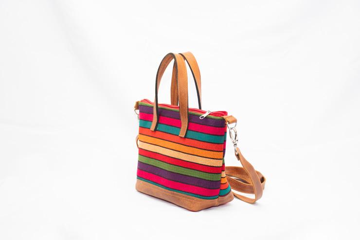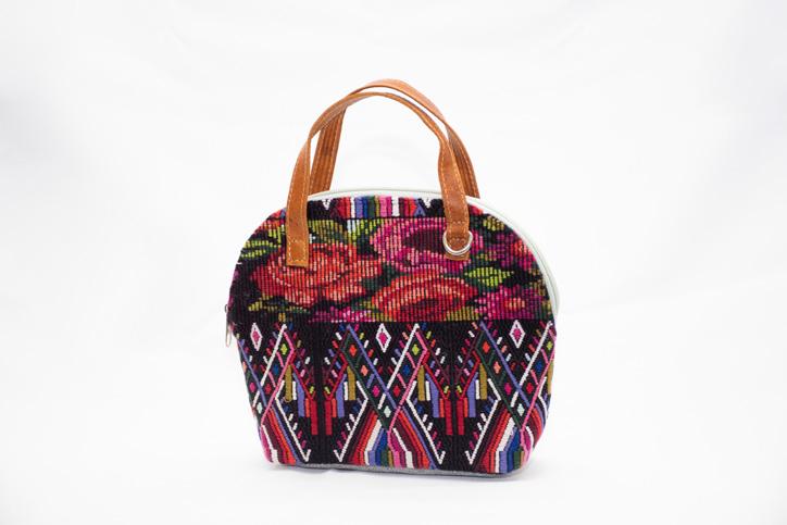 Bolso de mano maceta ( güipil reciclado): 23 cm ancho, 17 cm alto, asa 21 cm. Asa ajustable adicional 140 cm. materiales: cuero, hilo algodón, remaches de metal y zipper.