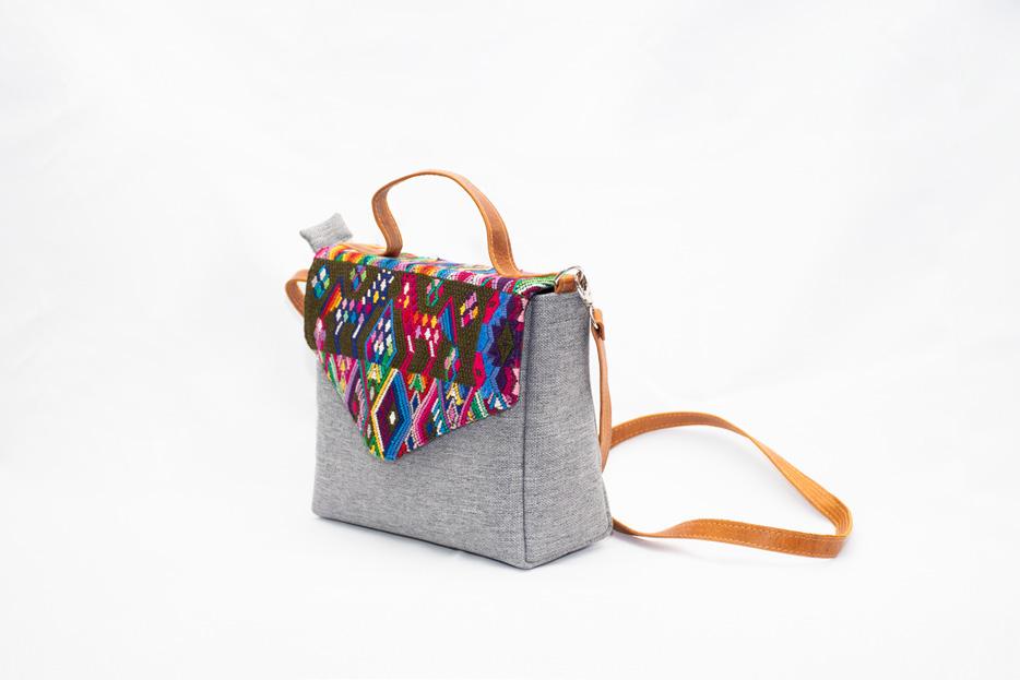 Bolso con tapadera (güipil reciclado): 20 cm ancho, 17 cm alto, asa 21 cm. Asa ajustable adicional 140 cm. materiales: cuero, hilo algodón, remaches de metal y zipper.