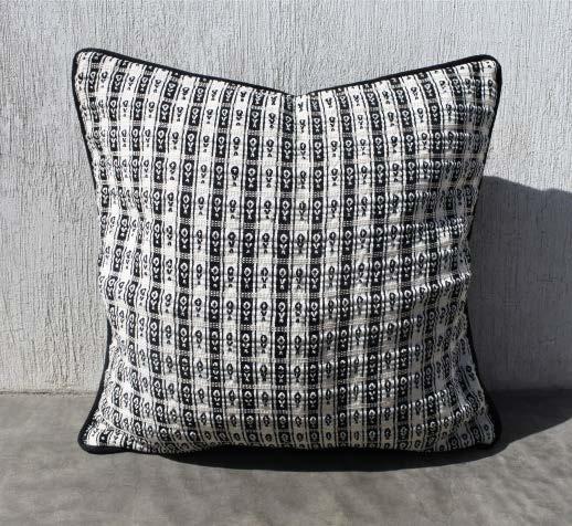 Almohada Cerro de Orro, una pieza sútil y elegante. Ademas de ser elaborada en telar de cintura tiene como toque especial la franja roja que esta elaborada en la técnica de JASPE, dichos patrones simbolizan al Cerro conocido como el Elefante Dormido que esta ubicado en la aldea de Cerro de Orro, a cercanias del pueblo y que es fuente de inspiración para esta pieza.