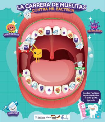 Estás fuera de casa y como no tienes tu cepillo dental, haces buchitos con agua pura para limpiar tus dientes mientras regresas para lavártelos. Avanza 2 casillas. Le enseñas a tus hermanitos pequeños a lavarse muy bien los dientes. Muy bien, avanza a la casilla 12.