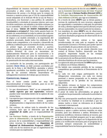 5. Venezuela forma parte de dos de estos OROP’s; como son la Comisión Interamericana del Atún Tropical (CIAT), que rige el Océano Pacifico Oriental (OPO) y la Comisión Interamericana de Conservación del Atún Atlántico (CICAA), que rige en el Atlántico. 6. Es a través de estos OROP’s que se dictan pautas y normas de explotación de esos recursos; asignando las capacidades o cantidades a cada país, los períodos de veda, y demás regulaciones que los afectan y en pro del uso sustentable y la conservación de los mismos. 7. Los mandatos de estas OROP’s son de observancia por parte de los países que los conforman y para lo cual tiene diseñados programas de observación de su cumplimiento. 8. Cuando los recursos entran a las aguas jurisdiccionales de cada país se requiere de una autorización (Licencia o Permiso) para poder ejercer las actividades de pesca dentro de ese territorio. 9. Venezuela, pese a no ser un estado ribereño (con costas) al Océano Pacífico, desarrolló una flota pesquera importante basado en las ventajas competitivas existentes en el país. 10. La presencia de esa flota permitió el desarrollo de los derechos históricos de acceso que hoy tenemos. 11. La captura de atún proveniente del OPO triplica la que se obtiene en el Océano Atlántico. 12. Ha habido una sostenida pérdida de las ventajas competitivas que permitieron el florecimiento de la flota. 13. La cada vez más exigua participación de las delegaciones venezolanas, con cada vez menos personal y menos preparado en la materia, está repercutiendo en la pérdida de los derechos adquiridos. 14. Ha habido retrasos en honrar los compromisos económicos con estos OROP’s, con la consecuente perdida de relevancia del país. 15. A pesar de todas las adversidades, un grupo de armadores ha permanecido realizando la actividad en el país. 16. Hay una preocupación manifiesta desde el gobierno en recobrar la vitalidad en la actividad y que las misma vuelva a tener su relevancia en al ámbito nacional e internacional. Para FUNDATUN fue un honor atender la solicitud de asistencia y apoyo a ambos sectores reunidos en estas jornadas; pues nos debemos a ambos. Brindamos las asistencias científicas y técnicas relativas al recurso, que es la base de la actividad pesquera por la que estaban sentados trabajando. Nos alegró ver la disposición de las partes a la rectificación necesaria para el progreso de la actividad, siempre enmarcada en sostenibilidad y responsabilidad hacia las futuras generaciones.