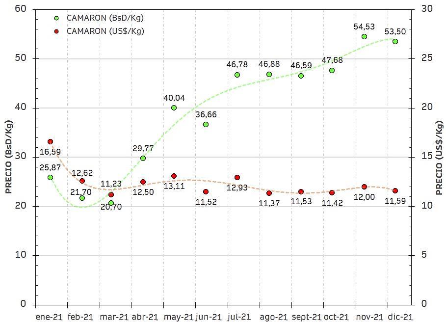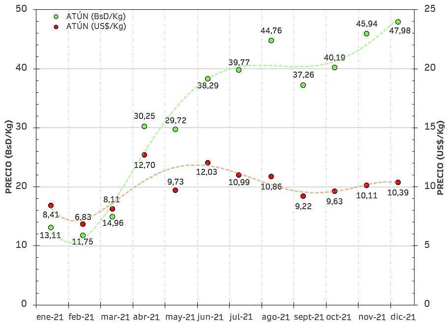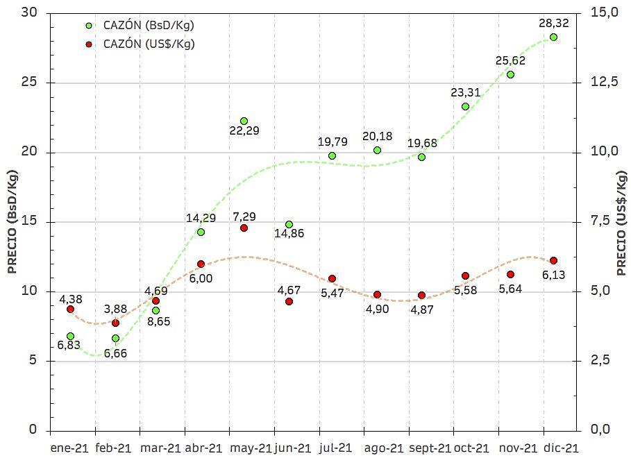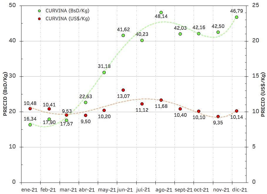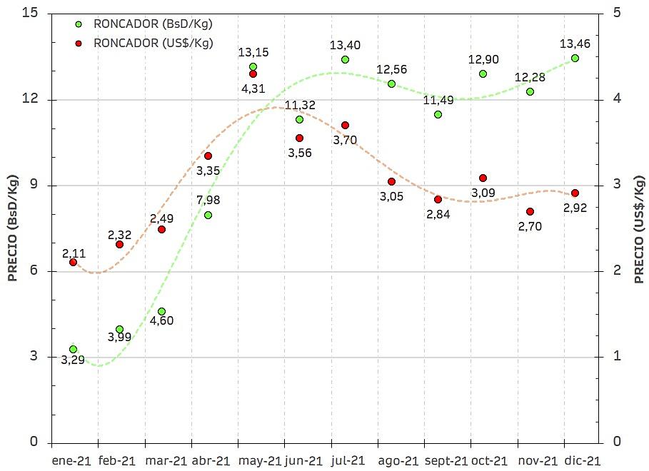 En la moneda nacional, el comportamiento del precio promedio se muestra bastante voluble hasta junio; período en el que alcanza su cotización mínima, de 3,72 BsD/Kg en febrero, y la máxima, de 19,37 BsD/Kg en mayo. Posterior a este período, el rubro entra en un ciclo de alza y descensos consecutivos que lo mantienen cerca de un promedio de 11,93 BsD/Kg; pareciera estar ajustándose el precio en la moneda nacional. Entre el inicio y el final del año, el rubro acumula un 45,86% de aumento en su cotización promedio en moneda nacional.