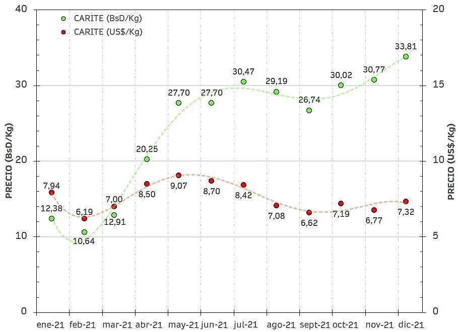 En la moneda nacional, el comportamiento del precio promedio por kilogramo experimenta una tendencia mensual continua al alza durante el año; salvo en el mes de agosto y diciembre, en los que registra un retroceso del 8,74% y 0,40% respectivamente con respecto al mes inmediato anterior. Entre el inicio y el final del año, el rubro acumula un 241,93% de aumento en su cotización promedio en moneda nacional.