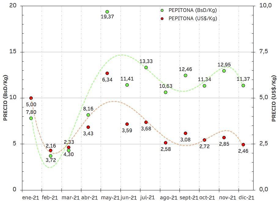 CASO 8: PEPITONA.- Este rubro también suele estar ubicado en el tercio inferior de la lista de evaluación; es decir de los que tienen menor cotización Al cierre del año 2020, su cotización promedio se ubicaba en los 4,02 BsD/Kg (Soto & Riera, 2020), equivalentes a unos 3,77 US$/Kg. Abriendo el año 2021 su cotización promedio se ubica en 7,80 BsD/Kg, unos 5,00 US$/Kg; mostrando una tendencia al alza, tanto en la moneda nacional (93,98%) como en la moneda extranjera (32,62%). Este comportamiento de alza en las dos monedas tiene su tiene explicación en la importante variación del precio promedio del rubro, con respecto a la variación de cotización de la moneda extrajera al iniciar el año.