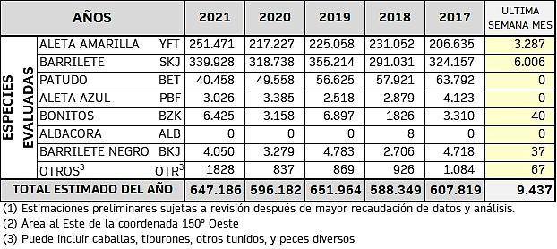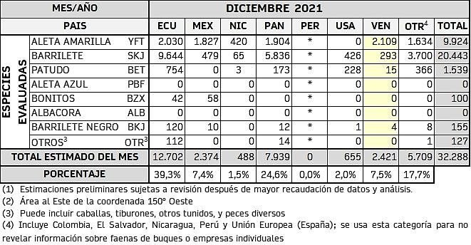 A continuación, se presenta los reportes contentivos de los valores de captura estimados por especie y por países para el mes de Diciembre; adicional a valores acumulados de los últimos cinco años y la información de la flota, desde inicio del año hasta el 31 de Diciembre (Tablas 1 a 3) del año en curso. Los reporte están basados en los informes semanales que realiza la Comisión Interamericana del Atún Tropical (CIAT) a los gobiernos para ayudar en la conservación y ordenación de la pesquería. De igual manera, se presentan los valores acumulados para la captura total del mismo período en los últimos cinco años, discriminada por país o grupo de países (Tabla 4).