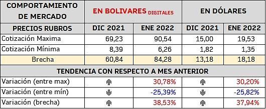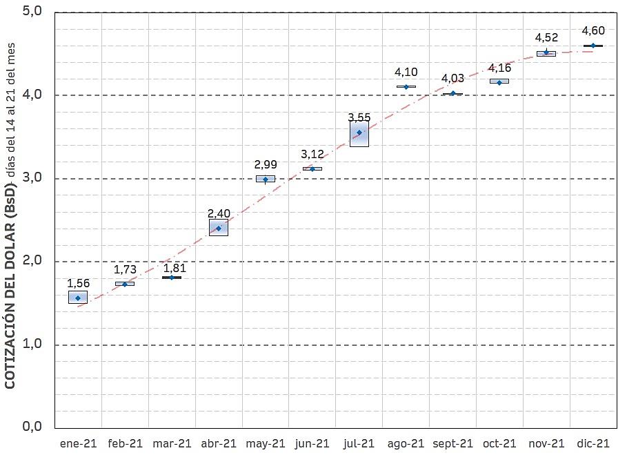 Al cierre del año 2020, el dólar se ubicaba en un precio promedio de 1,066 (± 0,013) BsD/US$ para la semana que se realiza la evaluación (Riera, 2021); disparándose un 46,26% apenas iniciando el año 2021, ubicando su valor en 1,56 (±0,055) BsD/US$. Al cierre del año 2021, su valor se ubica en los 4,60 (± 0,013) BsD/US$; representando un aumento de casi tres veces su valor promedio (294,82%) con respecto al valor de inicio de año. Saltos importantes en la cotización promedio de la moneda extranjera, respecto al mes inmediato anterior, se dieron en abril (32,76%) y mayo (24,35%); siguiendo en importancia, los que se dieron en julio (13,98%) y agosto (15,56%) La variación entre la cotización máxima y mínima, dentro de cada semana de evaluación, fueron inferiores al 4%; salvo en las semanas de enero, abril y julio, que superaron un 8% de variación. El comportamiento descrito es bastante diferente, en cuanto a la magnitud de los cambios, respecto al del año inmediato anterior; reportados en el boletín COFA CONVIVENCIA PESQUERA (Enero 2021) y con el empleo de sólo la información proveída por la fuente oficial (BCV, 2021).