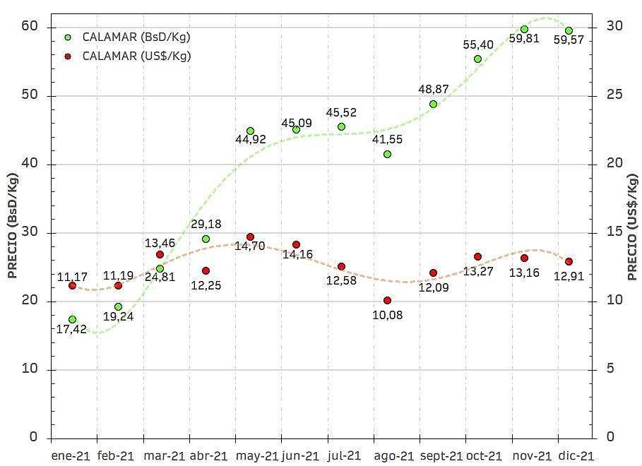 CASO 1: CALAMAR.- Este rubro suele pertenecer al tercio superior de los precios promedios en los rubros evaluados; es decir, de los que tienen alto precio promedio. Al cierre del año 2020, su cotización promedio se ubicaba en los 16,34 BsD/Kg, equivalentes a unos 15,32 US$/Kg (Soto & Riera, 2020). Abriendo el año 2021 su cotización promedio se ubica en 17,42 BsD/Kg, unos 11,17 US$/Kg; mostrando una tendencia mixta de alza en la moneda nacional (6,62%) y descenso en la moneda extranjera (-27,09%). Este comportamiento tiene su explicación en la variación de la cotización de la moneda extrajera al iniciar el año (46,26%); con lo cual, al no ser de igual proporción a la variación sufrida por el rubro, se ve esta dualidad.