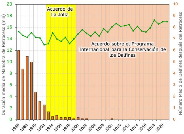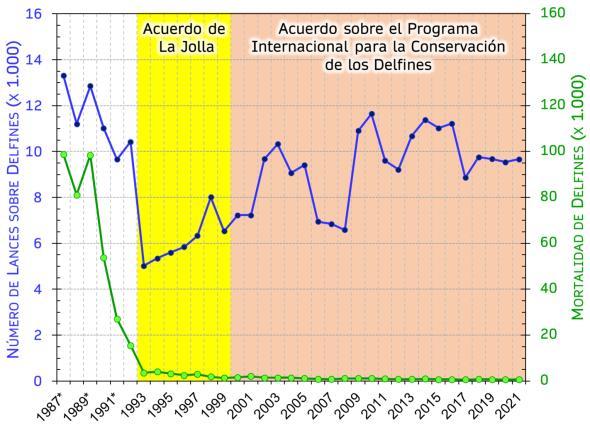 Durante el período 1986 89, la mortalidad incidental de delfines se estimaba rondaba cerca de los 100 mil delfines al año. Para 1992, año en el que se discutieron los objetivos de la CIAT para la protección de delfines y la investigación necesaria para realizarlos, la mortalidad incidental se estimaba a la baja; rondando menos de los 20 mil ejemplares. La entrada en vigencia del Acuerdo de La Jolla, en 1993, fija como objetivo una reducción gradual de la mortalidad incidental de delfines en 7 años (1993 1999), monitoreada por un Programa de Observadores a Bordo con 100% de cobertura, hasta llegar a menos de 5.000 al final de ese período. Sin embargo, la mortalidad incidental reportada para 1993 fue de 3.601 delfines, menor al objetivo trazado para el último año del acuerdo. Para el año 1999 se ubicó en 1.350 delfines, una cifra casi cuatro veces menor al límite establecido de 5.000 ejemplares.