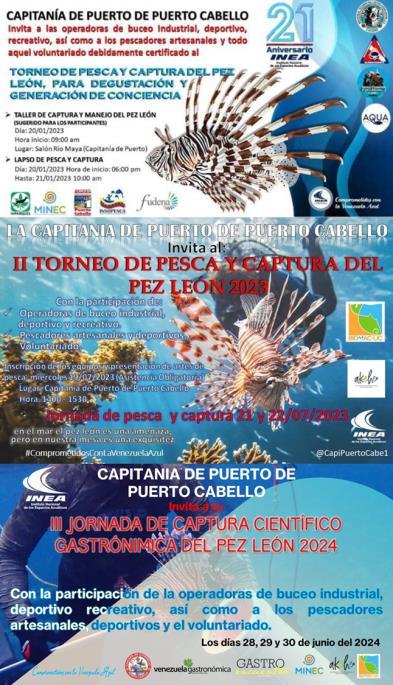 A través de la colaboración de una multiplicidad de instituciones como el Instituto Nacional de los Espacios Acuáticos (INEA), a través de la Capitanía de Puerto Cabello, la Fuerza Armada Nacional Bolivariana, el Departamento de Biología de la Facultad Experimental de Ciencias y Tecnología de la Universidad de Carabobo, el Instituto Socialista de la Pesca y Acuicultura (INSOPESCA) y el Centro Nacional de Investigación de Pesca y Acuicultura (CENIPA) del Ministerio de Pesca y Acuicultura (MinPESCA), el Instituto Nacional de Parques (INPARQUES), el Ministerio de Ecosocialismo (MinEC), Empresas de Buceo Comercial y Recreativo, pescadores y lancheros de la zona, agrupaciones de posaderos y restaurantes, Alcaldía Bolivariana del Municipio Puerto Cabello y la comunidad de GASTRO encuentro, se realizaron las tres primeras jornadas de captura y degustación del Pez León. La primera jornada, correspondiente al “Torneo de Pesca y Captura del Pez León para Degustación y Generación de Conciencia” se realizó los días 21 y 22 de enero de 2023; la segunda, “II Torneo de Pesca y Captura del Pez León 2023”, se realizó los días 21 y 22 de julio 2023; y la tercera, asociada a la “III Jornada de Captura Científico Gastronómica del Pez León 2024” abarcó del 28 al 30 de junio 2024 (tres días). Todas se realizaron en el municipio Puerto Cabello (edo. Carabobo), abarcando las aguas del Parque Nacional San Esteban y sus adyacencias.