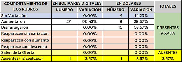 DATOS DE INTERÉS: Los datos que se presentan en la tabla muestran los precios promedios y su variación estadística para el grupo de rubros evaluados, tanto en la moneda nacional como en la divisa norteamericana, utilizando la tasa de cambio que fuera publicada por el Banco Central de Venezuela para los días en que se recolectaron los datos. Los precios al consumidor se presentan predominantemente en la moneda nacional, lo que permite observar casos como el de la “cabaña negra” que no muestra una variación del promedio entre los tres muestreos realizados; aunque solo estuvo disponible en uno de los comercios evaluados. El “camarón” se mantienen como el rubro de mayor valor, ubicándose en los 1.470 (± 81,85) Bs/Kg o unos 12,74 (± 0,30) US$/Kg, y la “sardina” como el de menor valor, ubicándose en los 130 (± 14,14) Bs/Kg a unos 1,13 (± 0,10) US$/Kg; ambos rubros muestran tendencia al alza en las dos monedas. El valor neto del aumento intermensual del rubro de mayor valor opaca el mayor aumento intermensual porcentual del rubro de menor valor, por lo que se registra un aumento de la brecha entre los valores máximos y mínimos Los rubros presentes que registran los mayores aumento de valor promedio son “cabaña blanca”, “medregal” y “pargo”; mientras los que registran la mayor disminución de valor promedio son “cojinúa” y “mero”. Un total de seis rubros (23,08%) mostraron un comportamiento dispar entre los precios promedios entre ambas monedas, pues su disminución en la moneda de referencia no compensa el alza de la cotización de esa moneda. Por otro lado, un total de trece rubros (50%) muestran alzas en ambas monedas, dos (7,69%) muestran tendencia a la baja en ambas monedas y un total de 5 rubros (19,23%) no estuvieron disponibles dentro de la oferta al consumidor. Es en este aspecto de las ausencias de oferta del rubro que la lista de evaluación irá evolucionando, pues se debe centrar en rubros que constantemente estén presentes y sujetos a las menores ausencias en la oferta; a efectos de ser un verdadero indicador del comportamiento de los precios al consumidor.