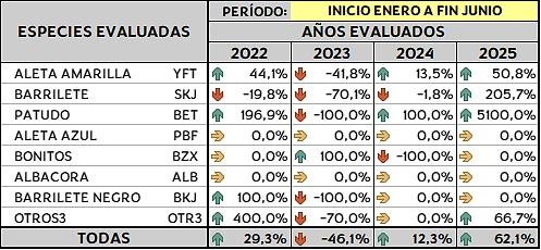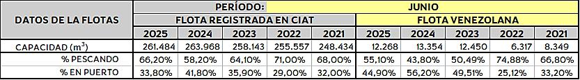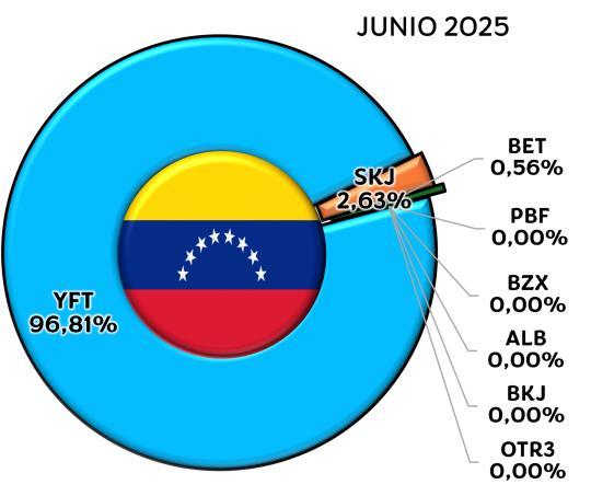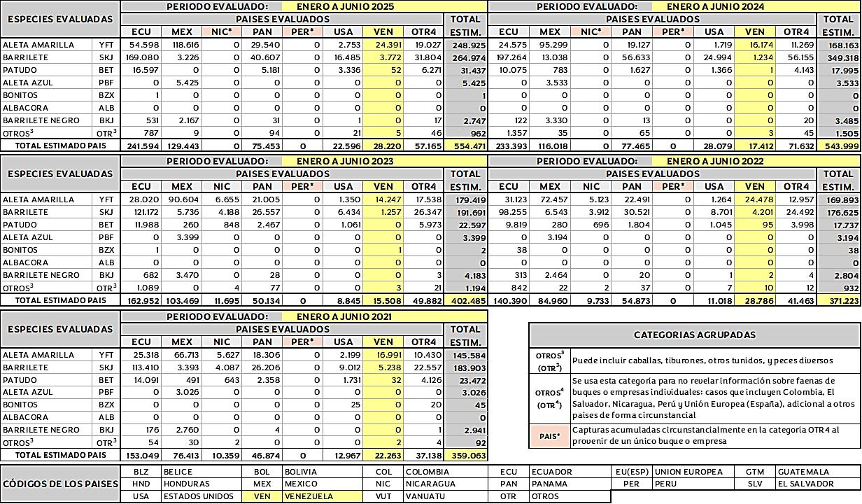 Se presenta los reportes contentivos de los valores de captura estimados por especie y por países para el mes de JUNIO del año 2025; adicional a valores acumulados de los últimos cinco años e información de la flota, desde inicio del año hasta el cierre del mes indicado. El reporte está basados en los informes semanales que realiza la Comisión Interamericana del Atún Tropical (CIAT) a los gobiernos para ayudar en la conservación y ordenación de la pesquería en el Área de la Convención, mejor conocida como Océano Pacífico Oriental (OPO). De igual manera, se presentan los valores acumulados para la captura total del mismo período en los últimos cinco años, por país o grupo de países. Los datos presentados corresponden a estimaciones preliminares, las cuales están sujetas a revisión posterior después de mayor recaudación de datos y análisis; por lo que no pueden ser tomadas como definitivas.
