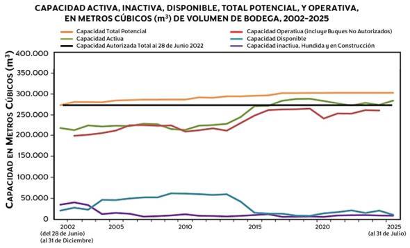 1.1 Atún Aleta Amarilla: Las capturas de esta especie en el año 2022 estuvieron por el orden de las 291.661 ton, para luego subir a 297.980 ton en el año 2023 y retroceder a 293.770 ton en 2024; sin embargo, hasta el 17 agosto del 2025, ya rondan las 323.760 ton. Las capturas de los años comprendidos entre 2022 a 2024 son las más altas registradas en estas pesquerías, con la exención de los años 2001 a 2003; que registraron capturas excepcionales de 382.702 ton, 412.507 ton y 381.107 ton. El nivel de las capturas reportadas provisionalmente hasta el momento en 2025 apunta a que podemos tener este año la mayor captura para esta especie reportada en el Océano Pacífico Oriental (OPO). Un dato inquietante que se relaciona con la pesca sobre plantados, donde predomina la captura de juveniles