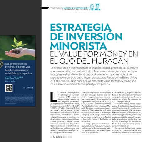 a Comisión Europea publicó su Estrategia de Inversión Minorista (RIS, según sus siglas en inglés) en mayo con una propuesta de reforma de las principales directivas del sector financiero como son MiFID II, IDD, UCITS, AIFMD y Solvencia II. Esta propuesta preocupa porque, si bien descarta una prohibición total de las retrocesiones, avanza hacia la misma vedando los incentivos en el servicio de recepción y transmisión de órdenes y mera ejecución y, además, porque introduce la obligación de justificar la proporcionalidad entre el valor que recibe el inversor y el precio que paga (value for money) tanto para fabricantes como para distribuidores. 60 FUNDSPEOPLE I NOVIEMBRE
