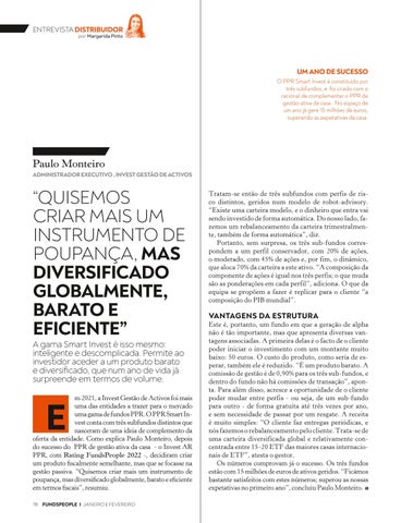 m 2021, a Invest Gestão de Activos foi mais uma das entidades a trazer para o mercado uma gama de fundos PPR. O PPR Smart Invest conta com três subfundos distintos que nasceram de uma ideia de complemento da oferta da entidade. Como explica Paulo Monteiro, depois do sucesso do PPR de gestão ativa da casa - o Invest AR PPR, com Rating FundsPeople 2022 -, decidiram criar um produto fiscalmente semelhante, mas que se focasse na gestão passiva. “Quisemos criar mais um instrumento de poupança, mas diversificado globalmente, barato e eficiente em termos fiscais”, resumiu. 78 FUNDSPEOPLE I JANEIRO E FEVEREIRO