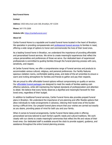 Phone: 347-775-2309 About US: Caribe Funeral Home is a reputable and trusted funeral home located in the heart of Brooklyn. We specialize in providing compassionate and professional funeral services to families in need, offering a wide range of options to honor and commemorate the lives of their loved ones. As a leading funeral home in Brooklyn, we understand the importance of providing affordable and personalized funeral services. We strive to create meaningful experiences that reflect the unique personalities and preferences of those we serve. Our dedicated team of experienced professionals is committed to guiding families through the funeral planning process with care, sensitivity, and respect. Related Searches: Funeral home | funeral home near me | funeral home Brooklyn | affordable funeral home Brooklyn | prepaid funeral plans Brooklyn | funeral arrangements Brooklyn | best funeral Home | cheap cremation Brooklyn | cheap coffins | cheap caskets | caribbean funeral services | american funerals | west indian funerals | international funeral shipping | Repass reception | mortuary shipping services domestic | mortuary shipping services international | cremated remains shipping domestic | cremated remains shipping international | funeral homes | funeral service | cremation service Additional Details Hours: Monday to Sunday: 24 hours