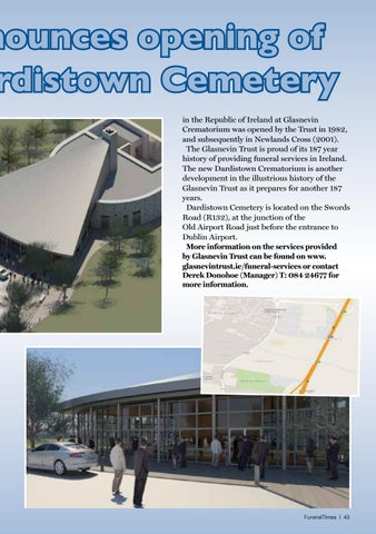 nounces opening of rdistown Cemetery in the Republic of Ireland at Glasnevin Crematorium was opened by the Trust in 1982, and subsequently in Newlands Cross (2001). The Glasnevin Trust is proud of its 187 year history of providing funeral services in Ireland. The new Dardistown Crematorium is another development in the illustrious history of the Glasnevin Trust as it prepares for another 187 years. Dardistown Cemetery is located on the Swords Road (R132), at the junction of the Old Airport Road just before the entrance to Dublin Airport. More information on the services provided by Glasnevin Trust can be found on www. glasnevintrust.ie/funeral-services or contact Derek Donohoe (Manager) T: 084 24677 for more information.