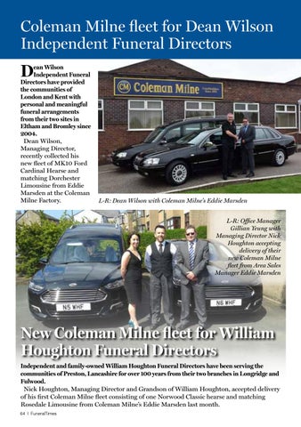 New Coleman Milne fleet for William Houghton Funeral Directors Independent and family-owned William Houghton Funeral Directors have been serving the communities of Preston, Lancashire for over 100 years from their two branches in Longridge and Fulwood. Nick Houghton, Managing Director and Grandson of William Houghton, accepted delivery of his first Coleman Milne fleet consisting of one Norwood Classic hearse and matching Rosedale Limousine from Coleman Milne’s Eddie Marsden last month. 64 | FuneralTimes